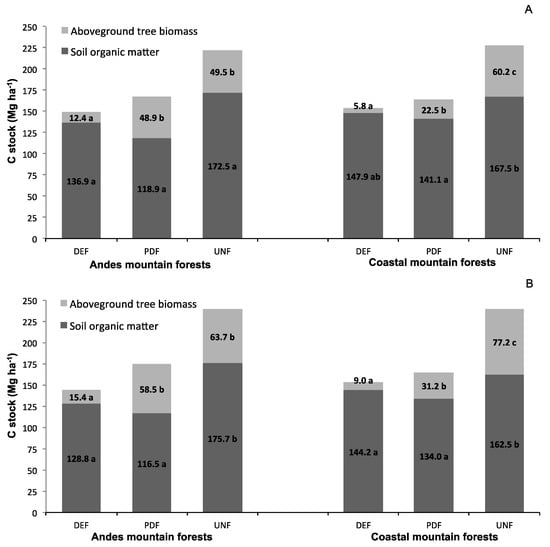The C stocks per hectare in total aboveground tree biomass (trunks, bark, branches, twigs, and leaves) that were calculated from results of the first forest inventory in the Andes mountains were similar in UNF and PDF, which were significantly greater (by a fourfold magnitude) than the DEF, as depicted in Figure 3A. The same trend was found in the Coastal forests, with the exception that all of the differences among forest conditions were significant (p < 0.05), with the C stock being almost four times larger in PDF than DEF, and the aboveground C stock in UNF was more than 2.5 and 10 times greater than PDF and DEF, respectively. In addition, it is interesting to see that although C stocks in aboveground tree biomass were over twice as large in the Andean DEF and PDF, as compared with Coastal mountain forests under the same conditions, they were 22% higher in the Coastal UNF than the Andean UNF (60.2 vs. 49.5 Mg·C·ha−1).