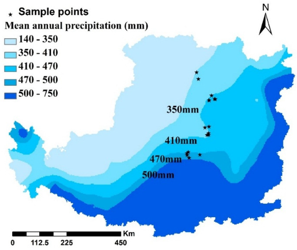 In 2014, 17 5 m × 5 m C. korshinskii plots were established. The estimated age of the shrubs according to interviews with local farmers were between 30 and 40 years old. Seven, six, and four typical sampling points were taken from the Semiarid-350, Semiarid-410, and Semiarid-470 precipitation zone, respectively. A preliminary field survey considering the geographic distribution and logistics were conducted during the process of determining those sampling points. The description of each sampling point is shown in Table 1. For comparative analysis, 10 abandoned lands were randomly chosen from the surrounding areas as a control group and the average soil moisture content was calculated for both C. korshinskii and control plots. All of the control plots had been abandoned for more than 20 years. Basic topographic information (longitude, latitude, elevation above sea-level, slope gradient, slope aspect, slope position) was collected using the Garmin GPS (version eTrex 30) and the geological compass (DQL-8).