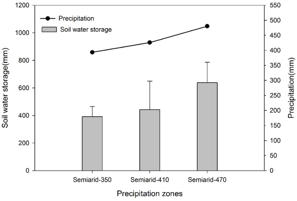 Comparison of the depth averaged soil water storage (0–5 m) under different precipitation zones.