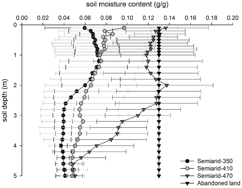 Figure 4 and one-way ANOVA showed that there were significant differences of SMCs among different precipitation zones. Vertical distribution of SMC was different among the three precipitation zones. Specifically, the SMC in the Semiarid-350 zone initially increased with soil depth, and then decreased until the 2.8-m depth where the SMC was relative stable. The SMC in the Semiarid-410 zone showed a decreasing trend from top layer to the 4.2-m layer and then reached stability. The SMC in the Semiarid-470 zone firstly decreased with soil depth, then increased and lastly decreased until 4.6-m layer, which showed a different vertical changing trend from the other two zones. Generally, the SMC under different precipitation zones within the 0–4.6 m profile was in the following order: Semiarid-470 > Semiarid-410 > Semiarid-350 (Figure 4), equating with the SWS shown in Figure 3. Figure 4 also showed the value of SMC in the three precipitation zones was smaller than that in abandoned land at most soil layers. Water deficit, calculated as the difference between control and treatment, occurred in all of the three precipitation zones. Greater surface water deficit, however, was observed in the area with lower rainfall (i.e., Semiarid-350 and Semiarid-410 zones), while deeper soil water deficit was more obvious in the Semiarid-470 zone, particularly from the 3-m layer onwards. The values of SMC at the deeper soil layer (i.e., 4.6–5 m) were almost identical between the three zones.