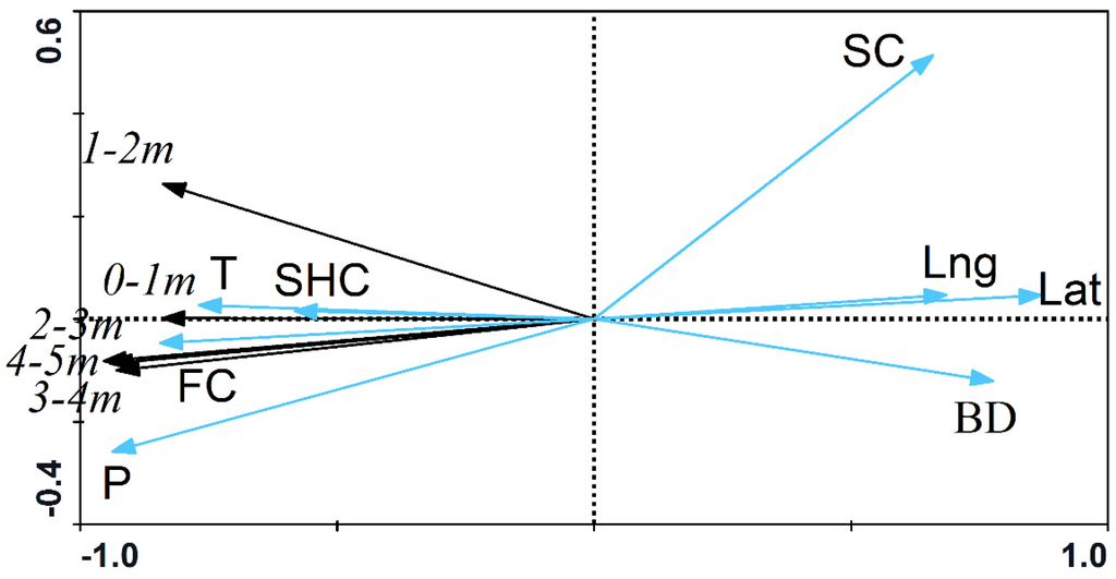 Although precipitation was the most significant factor affecting soil moisture under C. korshinskii, other environmental factors had different effects on different layers. Even on the surface soils (0–1 m), SMC was influenced by various factors other than precipitation (i.e., P, Lat, FC, BD, T) (Table 5), indicated by the overlapping soil moisture in 0–1 m layer and Axis 1 (Figure 5). These results were similar to another study in the Pernambuco semiarid region that also proved that soil properties had significant effects on soil moisture variability [48]. Bulk density most significantly affected SMC in the 1–2 m layer compared to the other soil layers, while field capacity had more effect on soil moisture of deep layers (2–5 m) than the 1–2 m layer.
