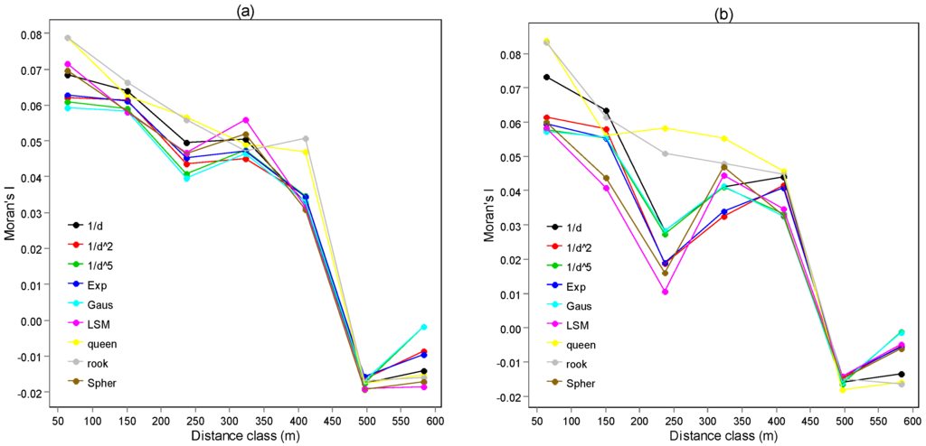 Circumvention of time and cost constraints in field-based forest inventory, foresters have increasingly regarded remote sensing data as a means of assisting and complementing, and forest canopy height was retrieved easily using LiDAR data and InSAR [22,73,74,75]. In reality, forest canopy height in a resolution cell is more similar to its nearby resolution cells because they have similar soil, topography, microclimate, etc., that is, there is a spatial autocorrelation between a resolution cell and its nearby cells. Therefore, considering the spatial autocorrelation into forest canopy height from LiDAR could improve the utilization of LiDAR in forest monitoring and forest inventory. Mcroberts [76] reviewed that the k-Nearest Neighbors (kNN) was a suitable approach to deal with spatial autocorrelation and improve the prediction of forest variables those were from most similar, or nearest resolution cells. There are three common selections for spatial weight matrices in kNN, including a constant value of 1, 1/d and 1/d2 [76,77,78]. These common spatial weight matrices within kNN were investigated to predict forest canopy height by Mcinerney et al. [74] and the result showed the performances of different spatial weight matrices depended on different k values and different bands. In addition to these common spatial weight matrices, other spatial weight matrices such as 1/d5, Gaus, Spher, Exp, queen, rook and LSM, may be suitable for reducing spatial dependence because different nearby resolution cells may generate the different spatial pattern (structure). Meanwhile, SLM could be regarded as an alternative model in height prediction for its assumption that the autoregressive process occurs only in the response variable, and SEM is also an alternative model for its assumption that the autoregressive process occurs in the unobserved variable. The spatial autoregressive model and spatial weight matrices incorporated into the height model of LiDAR can greatly increase height prediction accuracy.