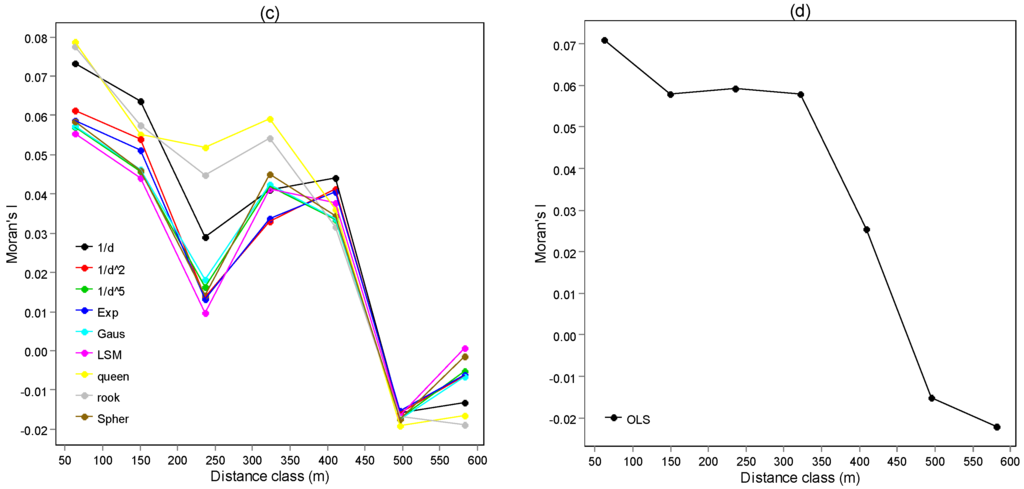 The spatial correlograms of OLS, SLM, SDM and SEM model residuals were constructed with the “pgirmess” package in R [68]. Figure 3 and Figure 4 show the spatial correlograms of model residuals and their p-values for the three SAR models with nine spatial weight matrices and the OLS model. Moran’s I of model residuals were a downtrend, and their p-values were an uptrend with increasing distance class in all models. When distance class increased from 400 m to 500 m, Moran’s I decreased the most, and the p value showed the largest increase. The difference between Moran’s I and I0 was not significant (p > 0.1) after the distance class of 500 m, indicating that there was no spatial autocorrelation among PSPs when the distance between PSPs was larger than 500 m. Moreover, when the distance class was 250 m, different spatial weight matrices had different performances on reducing spatial dependence in SDM and SEM, whereas there were similar performances with all spatial weight matrices in SLM. LSM was the best spatial matrix to reduce spatial dependence for the lowest Moran’s I and the highest p value, whereas the queen contiguity matrix was the worst in SDM and SEM (Figure 3 and Figure 4).