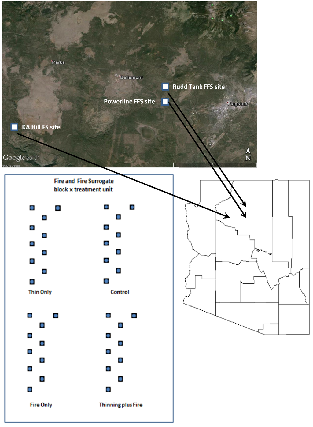 The ponderosa pine forests of the southwestern USA are the driest and most variable with respect to annual precipitation of all the FFS locations. The SWP site, located in north-central Arizona on the Coconino Plateau, was one of the eight ponderosa pine ecosystems within the FFS network. The SWP site is located in northern Arizona and consists of a randomized, complete block experimental design with 3 blocks and 4 treatments. Two of the replicate blocks (Rudd Tank: 35°14.0′05.9”, 111°44.0′58.4”, and Powerline: 35°12.0′33.9”, 111°45.0′32.2”) are located on the Coconino National Forest west of Flagstaff, Arizona, and a third block (KA Hill: 35°12.0′33.9”, 111°45.0′32.2”) on the Kaibab National Forest southeast of Williams, Arizona (Figure 1). Elevations range from 2217 to 2264 m and the forest overstory is dominated by ponderosa pine, with small populations of alligator juniper (Juniperus deppeana Steud.) and Gambel oak (Quercus gambelii Nutt.; [38]).
