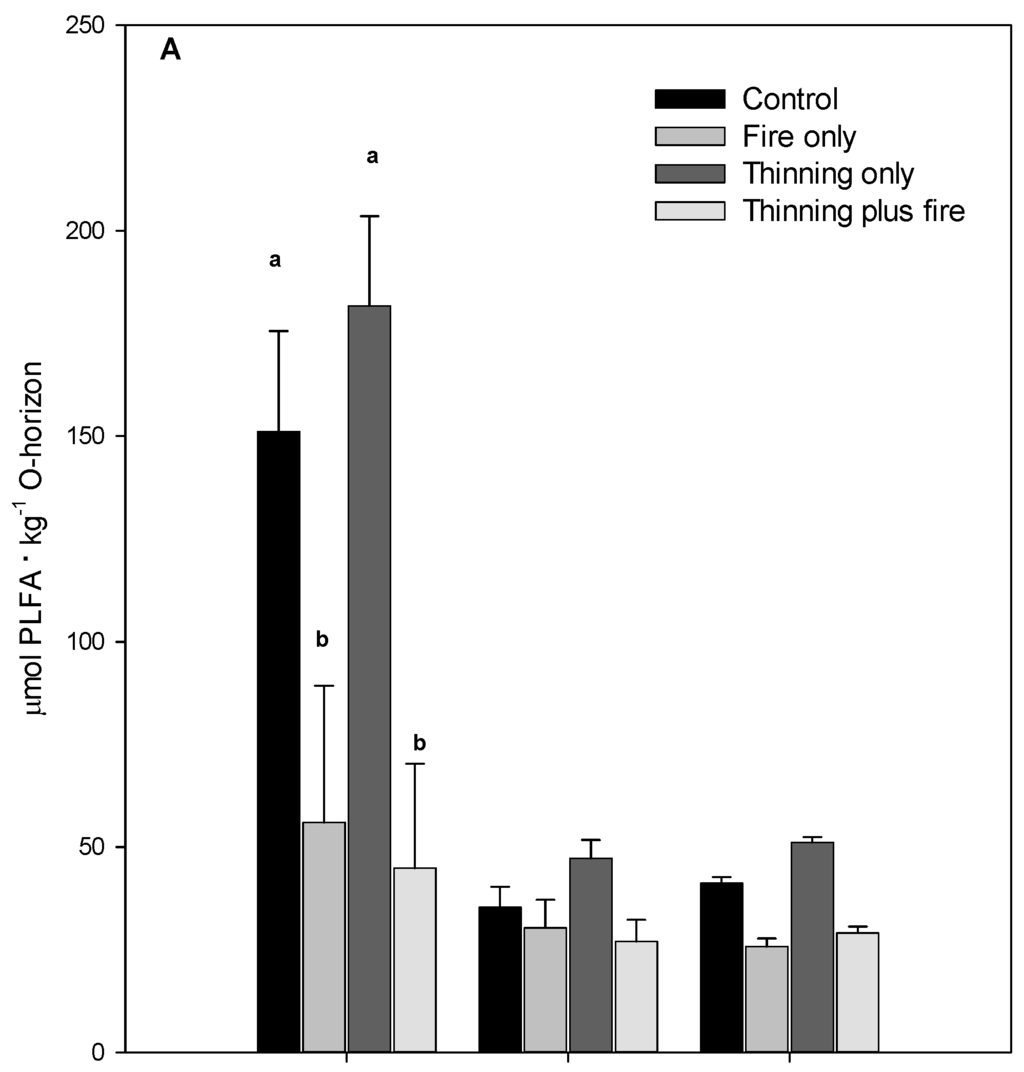 Mean microbial biomass in the forest floor (A) and mineral soil (0–5 cm; B) sampled 1-year post fuel reduction treatments at the Southwestern Plateau, Fire and Fire Surrogate study. Microbial biomass of different functional groups (mean + SE; n = 3) was determined using phospholipid fatty acid analysis (PLFA). Different letters for a given sampling date indicate significant differences (α = 0.05) using Tukey-Kramer pairwise comparison, generalized linear mixed model analysis of treatments. When no letters are provided, mean values among treatments were similar statistically.