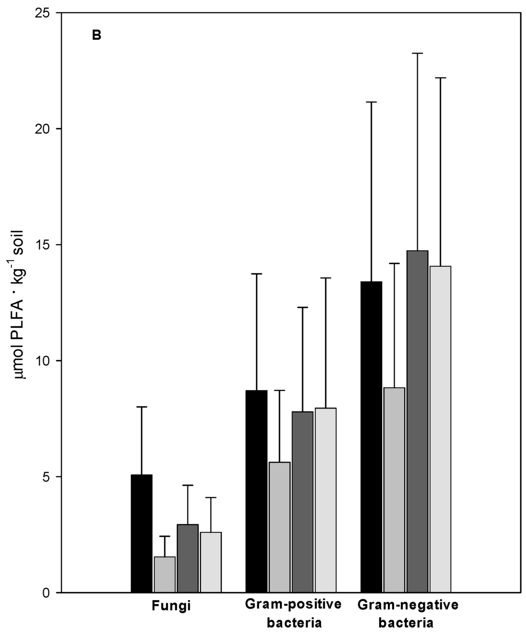 Multivariate responses of PLFA biomarkers and CLPPs for each sample were analyzed using multi-response permutation procedure (MRPP) [68]. Phospholipid fatty acid data were normalized to express the proportion of each specific biomarker mass relative to the total mass of all biomarkers for a given sample [69]. Community-level physiological data was normalized similarly using absorbance values. Phospholipid fatty acid biomarkers grouped by fungi, gram-positive bacteria, and gram-negative bacteria, and CLPP data grouped by substrate guild, were also analyzed statistically using GLIMIXX procedure described above. Multi-response permutation procedure does not require assumptions of multivariate normality or homogeneity of variances, which are seldom met with ecological community data [69]. Simultaneous pairwise comparisons, using the Peritz closure method to maintain Type I error rate and a prior alpha level (α = 0.05), tested the null hypothesis that all possible pairs are similar [70]. This procedure was performed using Microsoft Excel macros (available from the corresponding author) following the methodology of Mielke and Berry [68]. All values presented within the text are arithmetic means and standard errors (i.e., not back-transformed) across the three sites (n = 3) by treatment block. Site values for each treatment block were calculated from the mean values across the subplots (n = 10) within each block at that site.