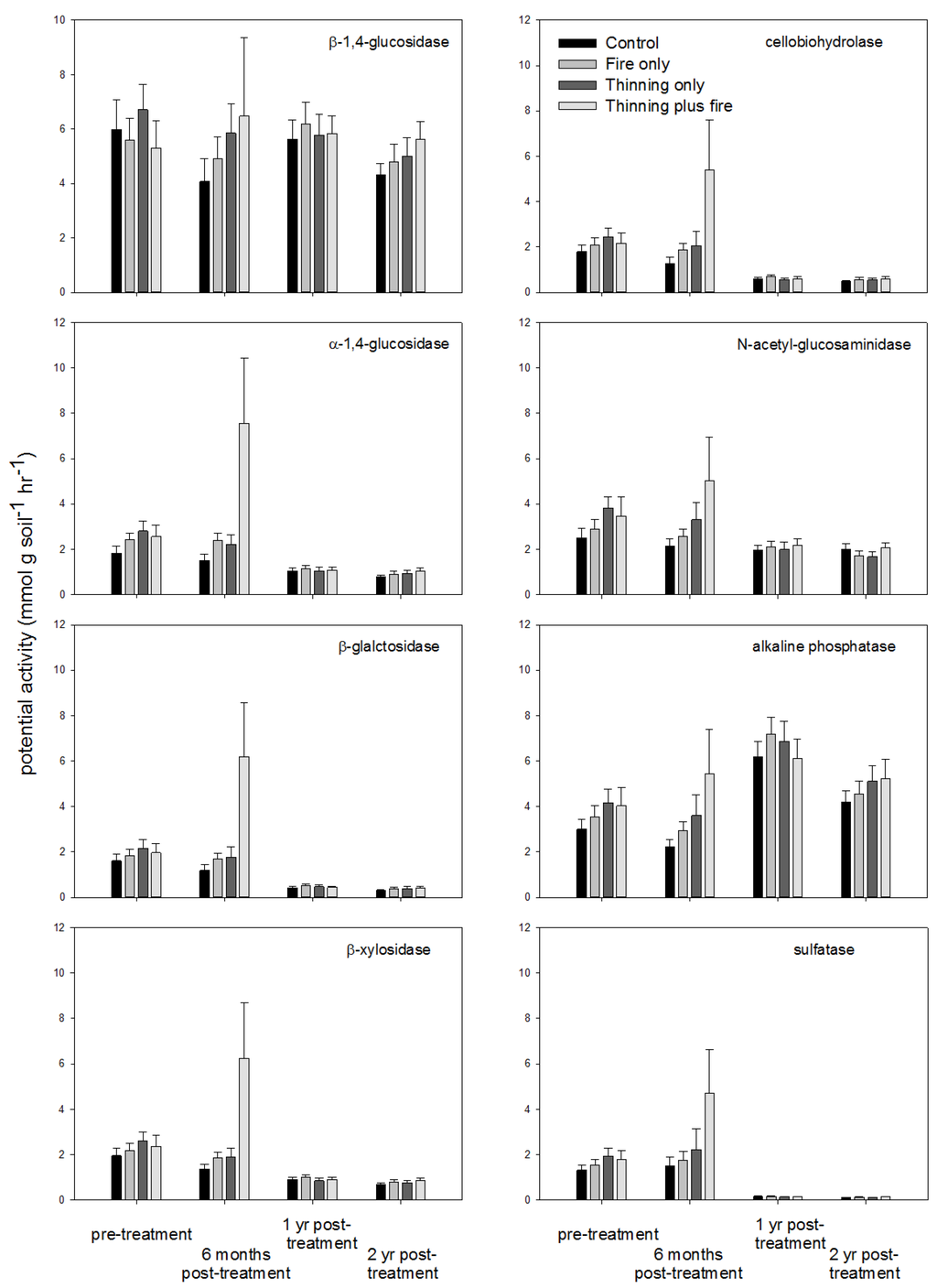 The observed mean + SE (n = 3) potential activity of eight enzymes in mineral soil (0–5 cm) pre- and post-fuel reduction treatments at the Southwestern Plateau, Fire and Fire Surrogate study site. Error bars are not visible when errors were small.