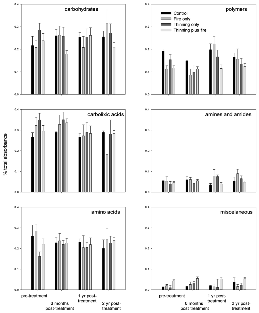 Community-level physiological profiles for bacteria (Biolog™ EcoPlate) in surface mineral soil (0–5 cm) 1-year post-treatment at the Southwestern Plateau, Fire and Fire Surrogate study site. Data shown are the observed mean catabolic activity + SE (n = 3) by substrate guild, normalized to the total catabolic activity in that treatment. No significant differences (α = 0.05) were found among treatments based on a multi-response permutation procedure.