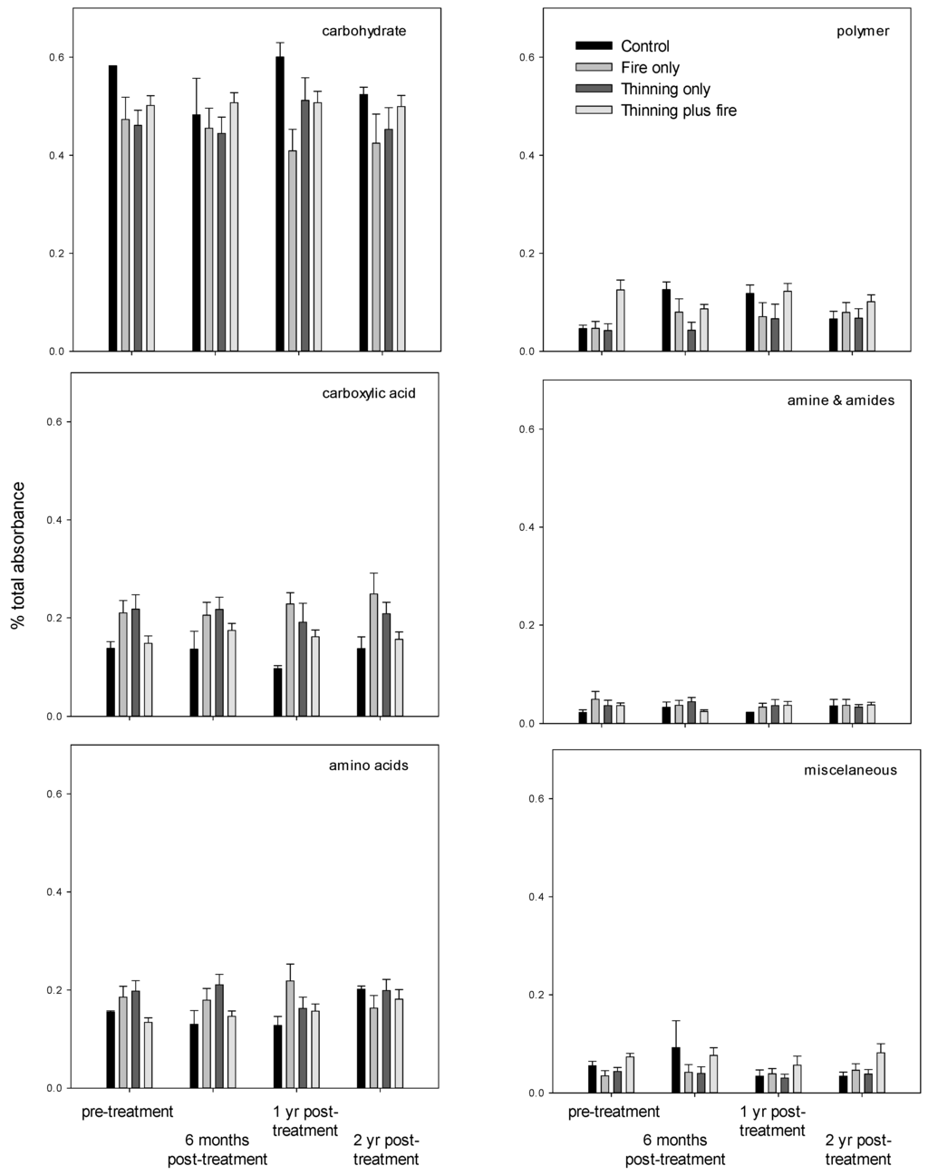 Community-level physiological profiles for fungi (Biolog™ SFN2) in surface mineral soil (0–5 cm) 1-year post-treatment at the Southwestern Plateau, Fire and Fire Surrogate study site. Data shown are observed mean catabolic activity + SE (n = 3) by substrate guild, normalized to the total catabolic activity in that treatment. No significant differences (α = 0.05) were found among treatments based on a multi-response permutation procedure.