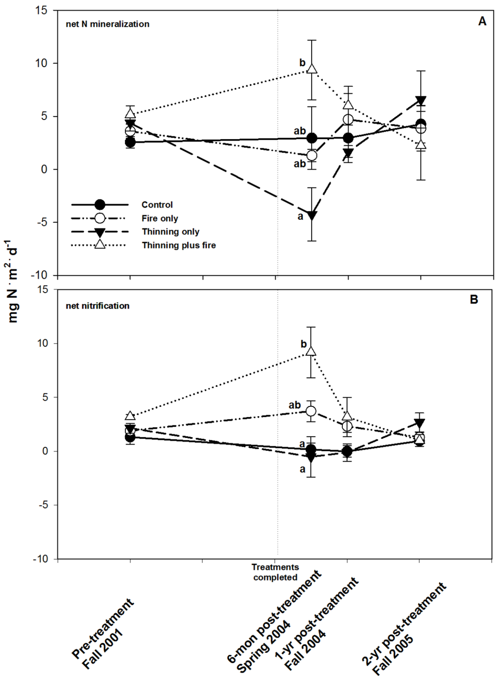 Mean ± one standard error (n = 3) net nitrogen (N) mineralization (A) and nitrification rates (B) in mineral soil (0–15 cm) at the Southwestern Plateau, Fire and Fire Surrogate study site pre- and post-fuel reduction treatments. Different letters for a given sampling date indicate significant differences, but sampling dates that share letters are not significantly different (α = 0.05) using Tukey-Kramer pairwise comparison following a significant repeated measures, generalized linear mixed model analysis of treatments. When no letters are provided, mean values among treatments were similar statistically.