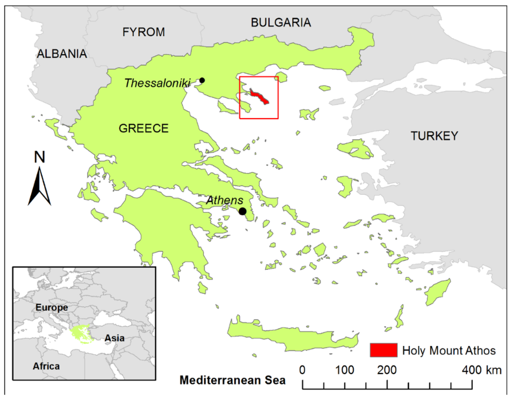 The area of study is Holy Mount Athos, which is located in the northeast of Greece and belongs to the jurisdiction of the Patriarch of Constantinople. The total area of Mount Athos is 33,042 ha with a length of around 50 km and a width that varies between 8 and 12 km (Figure 1). The topography consists of a mild wavy row of hills in the central part of the peninsula with a gradually increasing altitude that varies between 450 and 990 m before climbing to an altitude of 2033 m to the southeast in the summit of Mount Athos itself. Also the whole area is traversed by deep, steep gullies alternating with steeper folds.