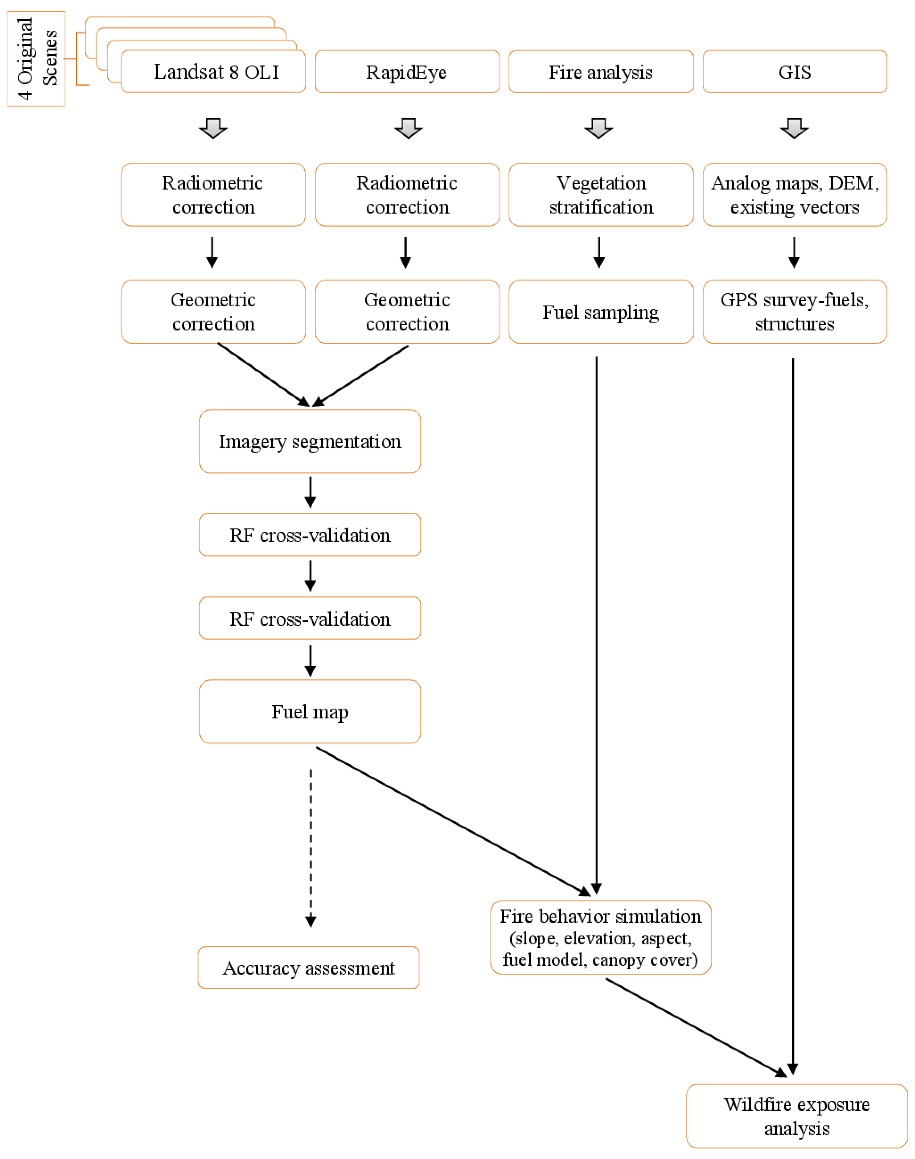 With regard to remote sensing data, a high spatial resolution RapidEye satellite image (Level 3A) acquired on May 2014, along with four images acquired from Landsat 8 Operational Land Imager (OLI) sensor (path/row 183/032), were used to extract fuel cover of Holy Mount Athos.