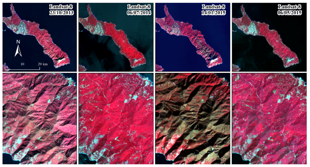 The Nearest Neighbor resampling method was applied for projecting the RapidEye image to the Greek National Geodetic System (EGSA 1987). The pre-processing of Landsat 8 images included the geo-rectification of image subsets by manual extraction from the study that were rectified based on the RapidEye imagery. The geo-rectification was done using 45 ground control points, a 5-m spacing Digital Elevation Model (DEM) of the area, and second-order polynomial coefficients. All satellite images were delivered as digital numbers (DN) at first place.