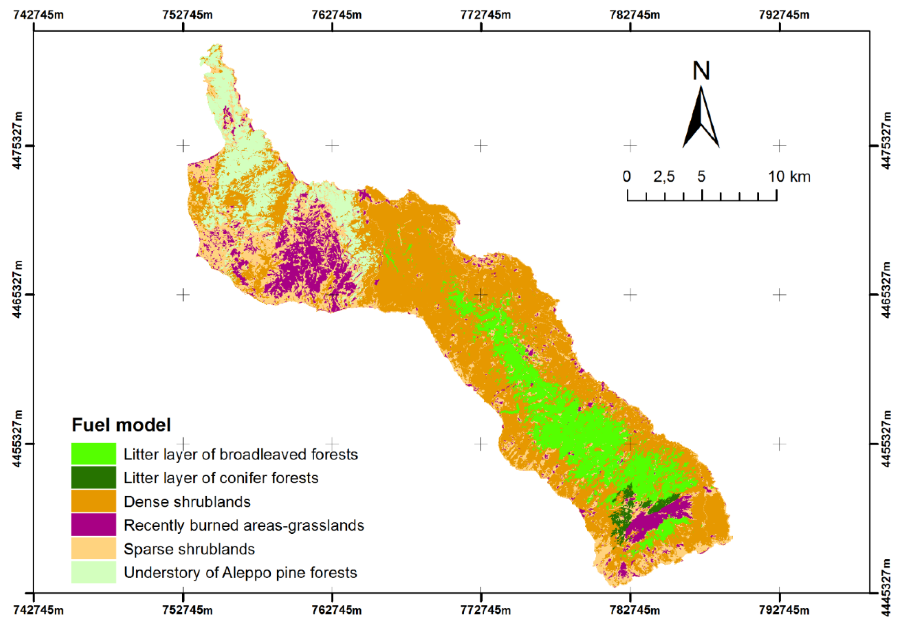 Classification of the satellite image provided the spatial extent of the different fuel types (Figure 5). As can be seen, the majority of the area is covered with dense shrublands (43%), sparse shrublands (18%) broadleaved (14%), and Aleppo pine forests (36%). The smallest extent is covered by conifer species (2.3%).
