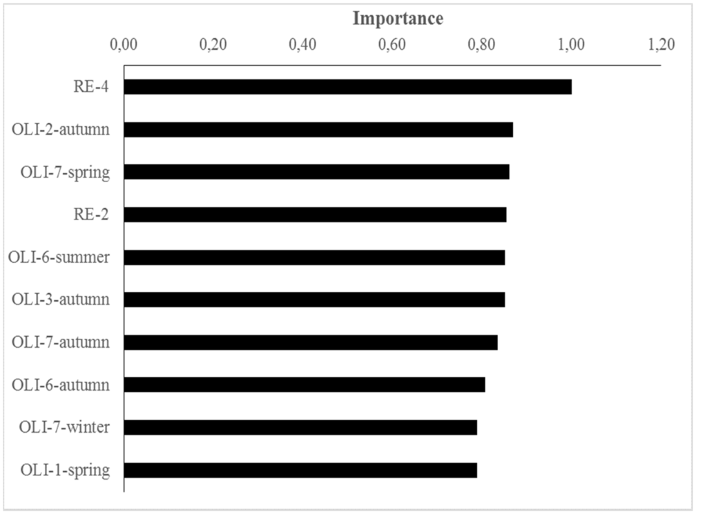The red-edge spectral band proved to be the most important one (Figure 6). Previous studies similarly reported an increase in classification accuracy related to this finding [39].