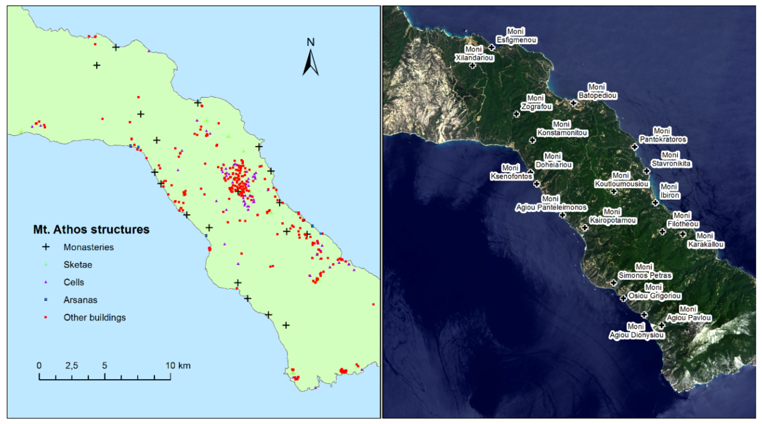 Mt. Athos includes lodgings and structures of different size and construction quality. These include monasteries, sketes, cells, arsanas, hermitages, and small chapels and churches. There are 20 monasteries located on the Mt. Athos. In addition, cells are houses with a small church, where 1–3 monks live under the spiritual and administrative supervision of a monastery. Sketes represent small communities of neighboring cells. Finally, arsanas represent assigned landing areas of the monasteries or sketes.