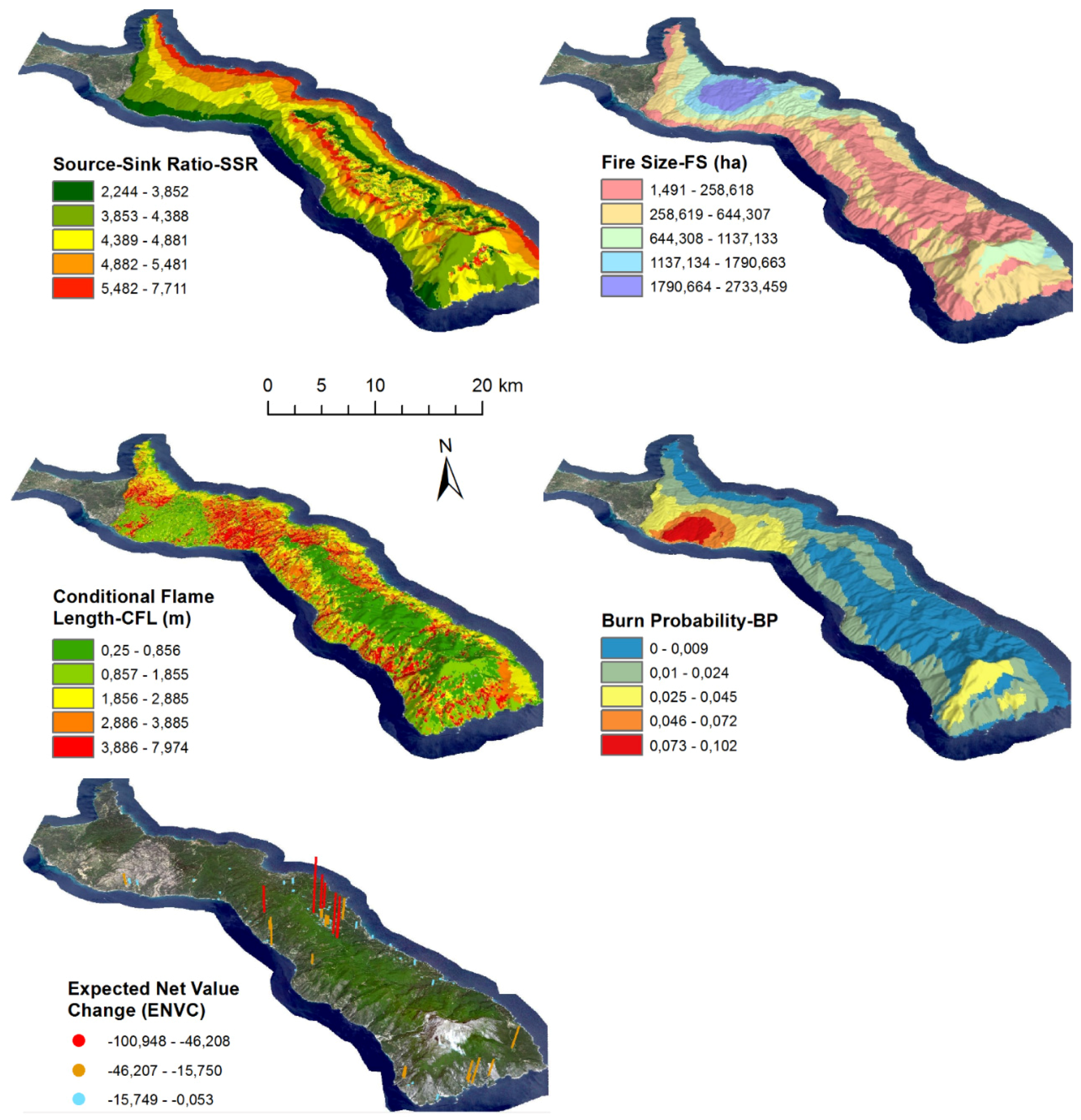 - Thompson, M.; Calkin, D.; Finney, M.; Ager, A.; Gilbertson-Day, J. Integrated national-scale assessment of wildfire risk to human and ecological values. Stochast. Environ. Res. Risk Assess. 2011, 25, 761–780. [Google Scholar] [CrossRef]