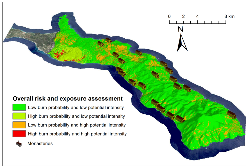 Fire risk and exposure assessment in Mt. Athos (UTM Zone 34N).