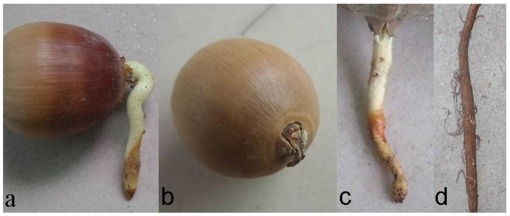 By using the flotation method [36], we selected 300 sound acorns for germinating experiment in May 2011. To reduce the influence of seed size on seedling emergence and development, the medium-size acorns of 2.5–3.5 g were chosen to conduct germination experiment. We planted acorns in a plastic box (35 cm × 25 cm × 4 cm) under the condition of natural photoperiod and ambient temperature. The acorns were covered with a layer of saw-dust, and watered timely. Status of seed germination and radicle development were examined every morning. Development of radicle was divided into two stages: (1) un-lignified radicle stage (ULRS), referring to early stage: the growing radicle was tender, white in color, and without root hair and lateral root (Figure 1c); and (2) lignified radicle stage (LRS), referring to later stage: the growing radicle has become hard, brown in color, and emerged root hair or lateral root (Figure 1d). Acorns with two types of radicles were prepared for the next experiment (Figure 1).