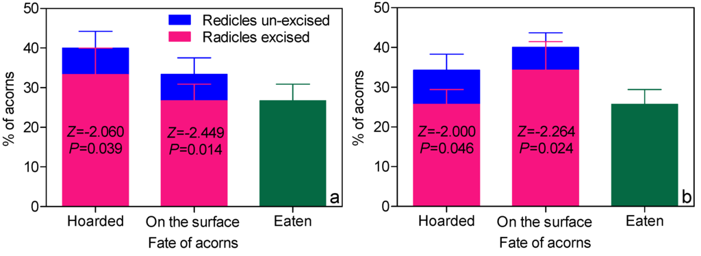 The processing and hoarding of rodents on germinated acorns in ULRS (a) and LRS (b). The proportion of radicle-excised acorns (pink bar) and radicle un-excised acorns (blue bar) was compared in Two-Related Samples Wilcoxon Tests.
