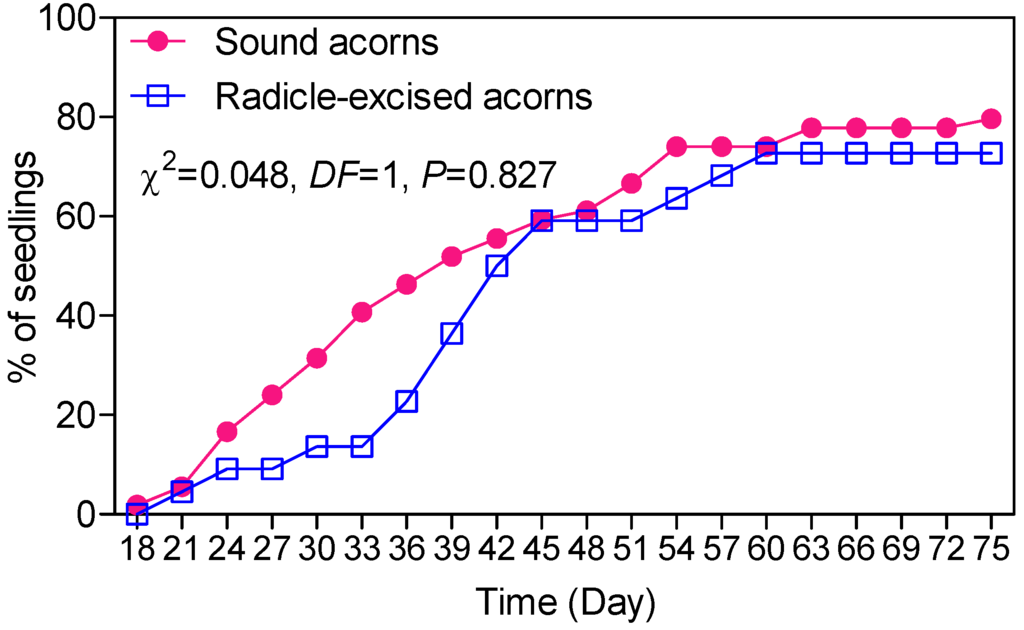 The germination rate of sound acorns and radicle-excised acorns (in ULRS) were 79.63% (43/54) and 72.73% (32/44), and no significant difference was found between them (χ2 = 0.320, DF = 1, p = 0.571). Surprisingly, none of the radicle-excised acorns in LRS germinated again (0/48).