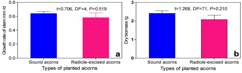 Growth rate of seedling stem (a) and dry biomass of seedlings (b) from sound acorns and radicle-excised acorns. To reduce the influence of emergence date (e.g., climatic factors) on seedling development, the seedlings emerging at same day were chosen to calculate the growth rate of stalk. So, the available sample was less than the total sample when compared the growth rate of stalk.