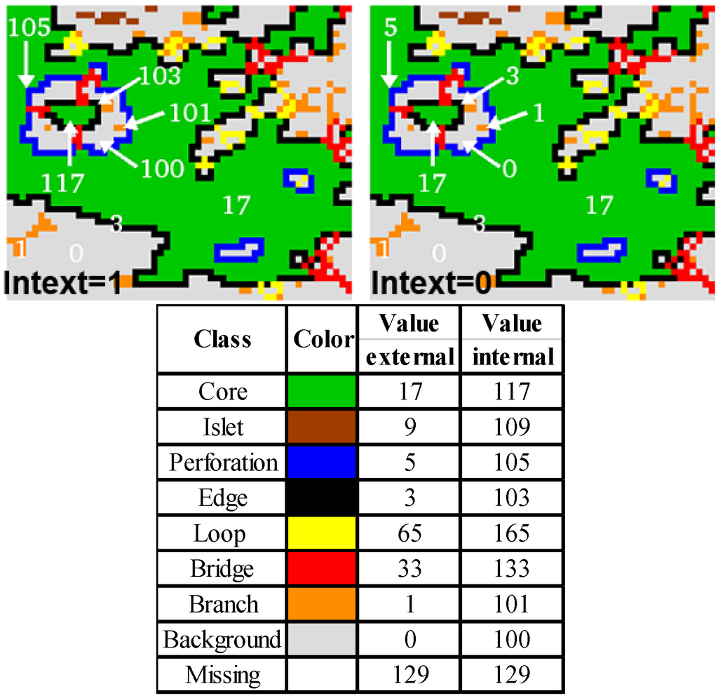 The intext parameter allows for differentiating between internal and external features. Internal features are defined as those being enclosed by cells classified as Perforation (i.e., they are found in gaps in Core areas; see Figure 2). When the intext = “On”, internal and external features are classified into different fragmentation classes. Internal fragmentation classes are assigned a numeric identifier value that adds 100 to the values identifying each of the basic fragmentation classes (see Figure 2 legend). The purpose of changing the intext parameter from “Off” to “On” was to explore if there are differences in fragmentation levels and the behavior of the fragmentation-class transitions between internal and external forest areas.