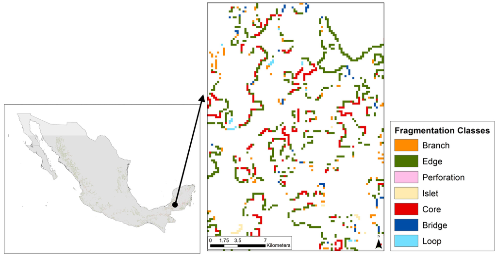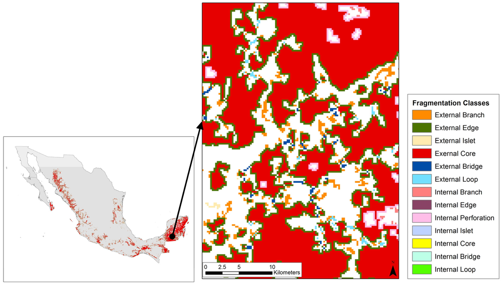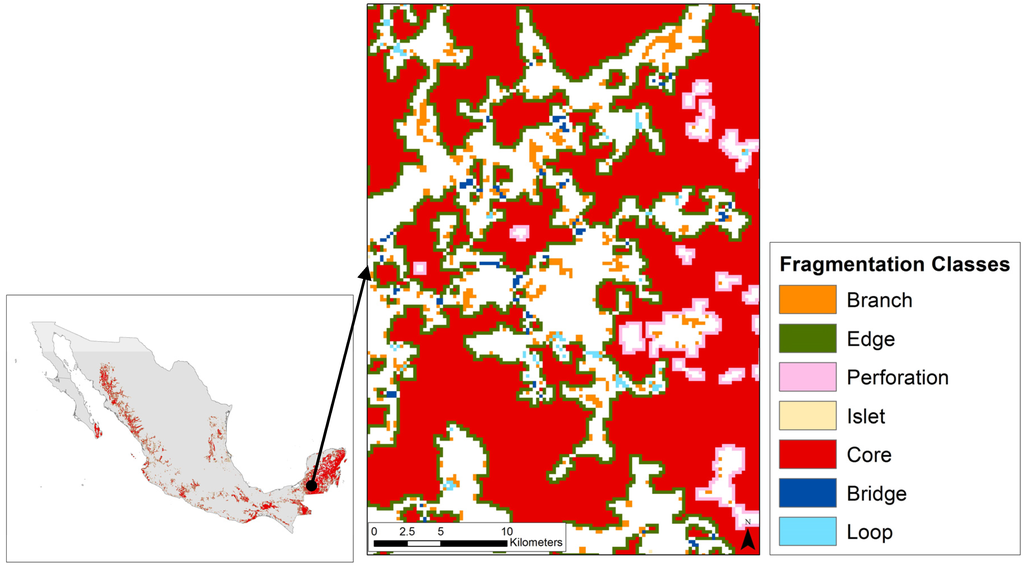 Mexico is considered to be “megadiverse” and is one of the five biologically richest countries [40]. Studying the effects and evolution of forest fragmentation in Mexico is fundamental to protecting the country’s rich biodiversity, as well as its forest ecosystem functions and services. National level assessments on patterns of forest fragmentation in Mexico have been performed in the past [37,38,39]. Moreno-Sanchez et al. [34,35] provide numerical metrics of fragmentation in tabular form on the change in forest fragmentation in Mexico over time. However, this information has no explicit spatial reference. Moreno-Sanchez et al. [36] provided a national level assessment on changes of forest fragmentation in Mexico using a methodology that produces maps of the levels of fragmentation. Since then, updated land use/cover data for Mexico have been released and a new methodology for characterizing the spatial pattern of the forests has been sanctioned and agreed upon by a large number of national and international forestry agencies. We make use of both in this study.