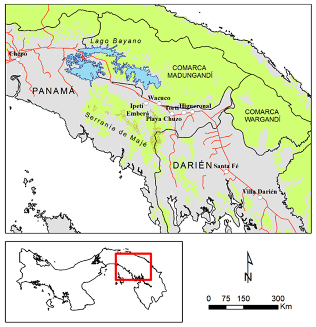 - Wali, A. Diagnostic Analysis of the Bayano Region and the Eastern Darién of Panama; Inter-American Foundation: Washington, DC, USA, 1989. [Google Scholar]