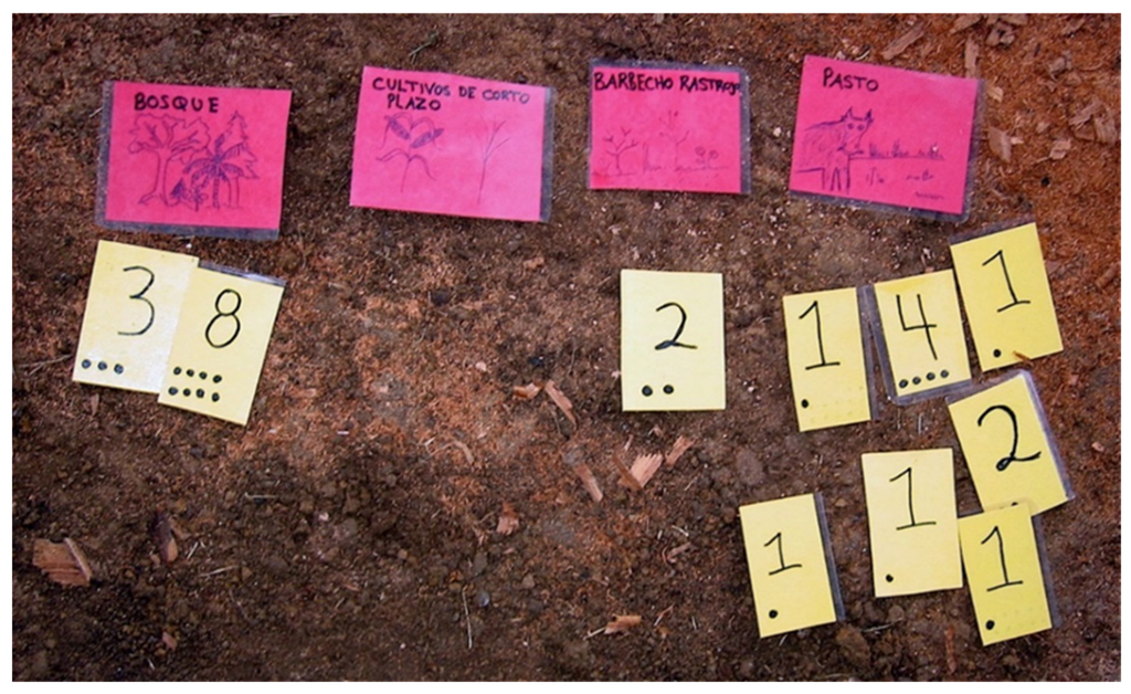 Cards Denoting Land Use/Covers (Red) and Number of Hectares (Yellow) Used to Reconstruct Household Land-Use Histories. Note: in this photo, the columns of cards indicate that there were 38 hectares in forest (bosque), two hectares in fallow (barbecho rastrojo), and a sum of 11 hectares in pasture (pasto) for the year in question. The notable accumulation of multiple small-denomination cards under the pasture card is indicative of the fact that, in any given year, only one or two hectares would typically have been taken from forest for subsistence agriculture (cultivos de corto plazo), which would subsequently be passed to fallow (as shown) and then ultimately to pasture, where it would remain.