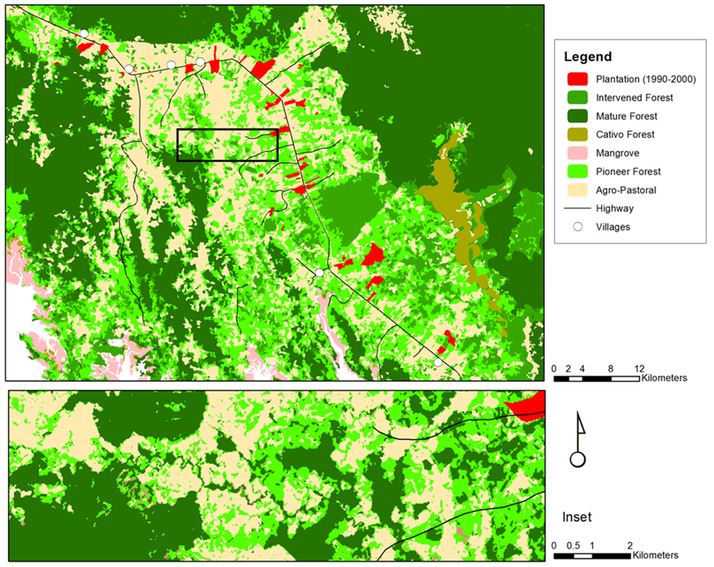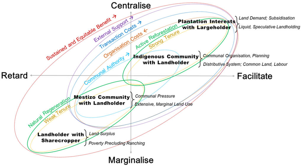 Due to this transformation, landholders, communities, commercial interests, and government have increasingly diverse interests, fostering, in turn, increasingly dynamic interactions. The theoretical frameworks previously discussed anticipate a variety of potential interactions underlying forest-cover gain. Landholders interacting with employers for wage incomes could withdraw from relatively unprofitable agricultural activities and revert their marginal landholdings to forest. Such interactions may be effectively costless and so theoretically extensive, assuming three conditions: namely, that landholders maximise wage incomes and allocate labour off-farm accordingly; that such labour allocations actually preclude continued, extensive agriculture; and that other landholders endure the significant opportunity costs of not reclaiming disused lands. Community entities, in interaction with withdrawing landholders, might organise to bear these costs in order to protect scarce forest environmental services, such as water provision. However, community organisation presumes perhaps optimistically that the benefits of protecting even increasingly scarce environmental services will offset ongoing organisational costs—a tenet dependent on effective institutions, clear rights to land and resources, and a widespread valuation of secondary forests [34,56]. Reforestation subsidization would increase the rent and thus “benefit” of planted forests and in turn extend them to more central situations in the landscape subject to community influence as well as landholders traditionally unaligned with forest management. Whether and how reforestation would be practiced in such situations would reflect negotiations between landholders, communities, and established forestry interests. In some instances these may indeed centre on rent maximisation, but in the risk-adverse frontier setting other instances may favour arrangements minimising the costs of plantation establishment. Arrangements may also reflect political-ecological legacies favouring relatively powerful agents who disproportionately “capture” benefits from resource exploitation.