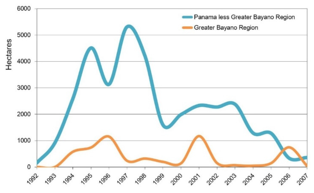 Annual area established in forest plantation, in hectares, for Greater Bayano Region and Panama, 1992–2007. Source: Data from Forest Registry of ANAM.