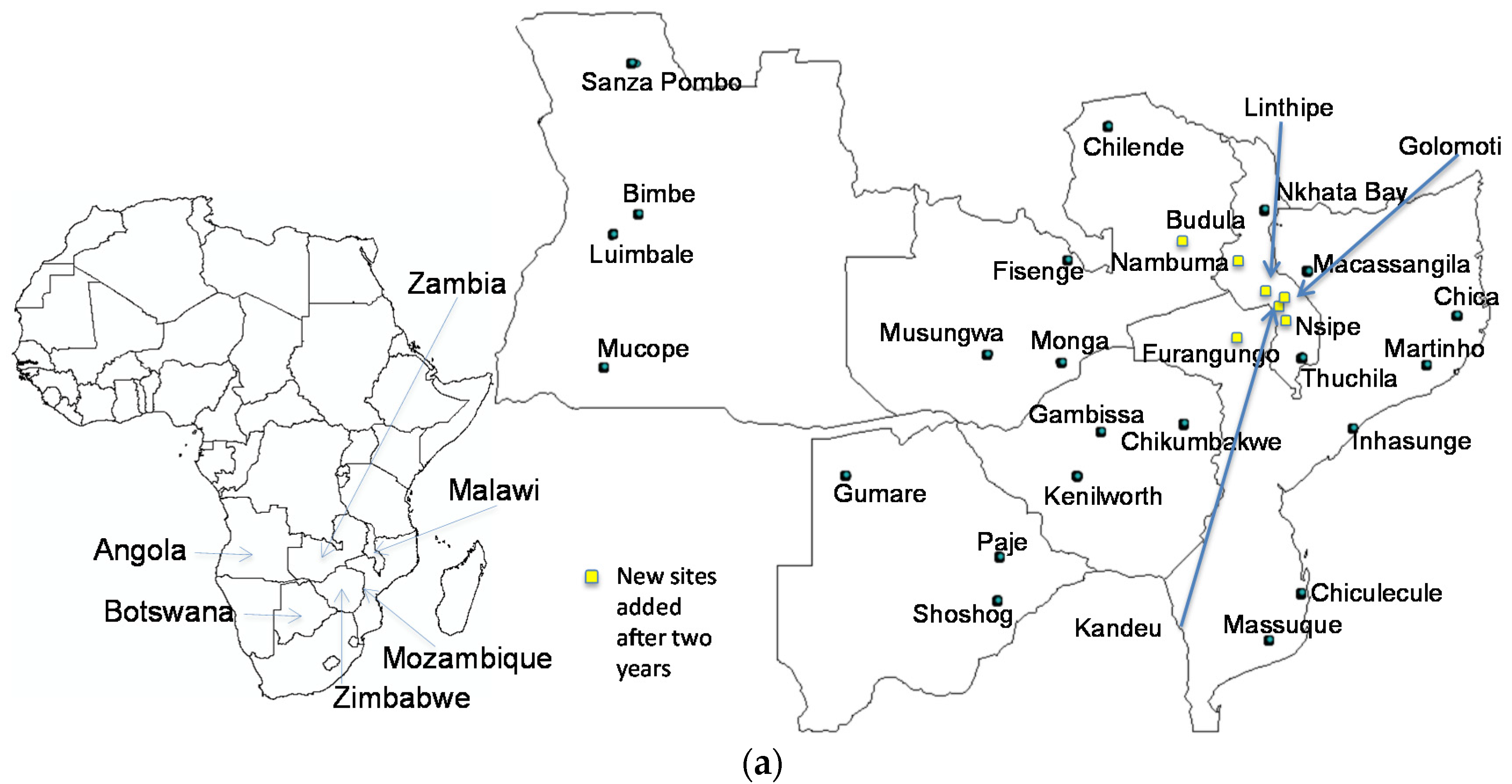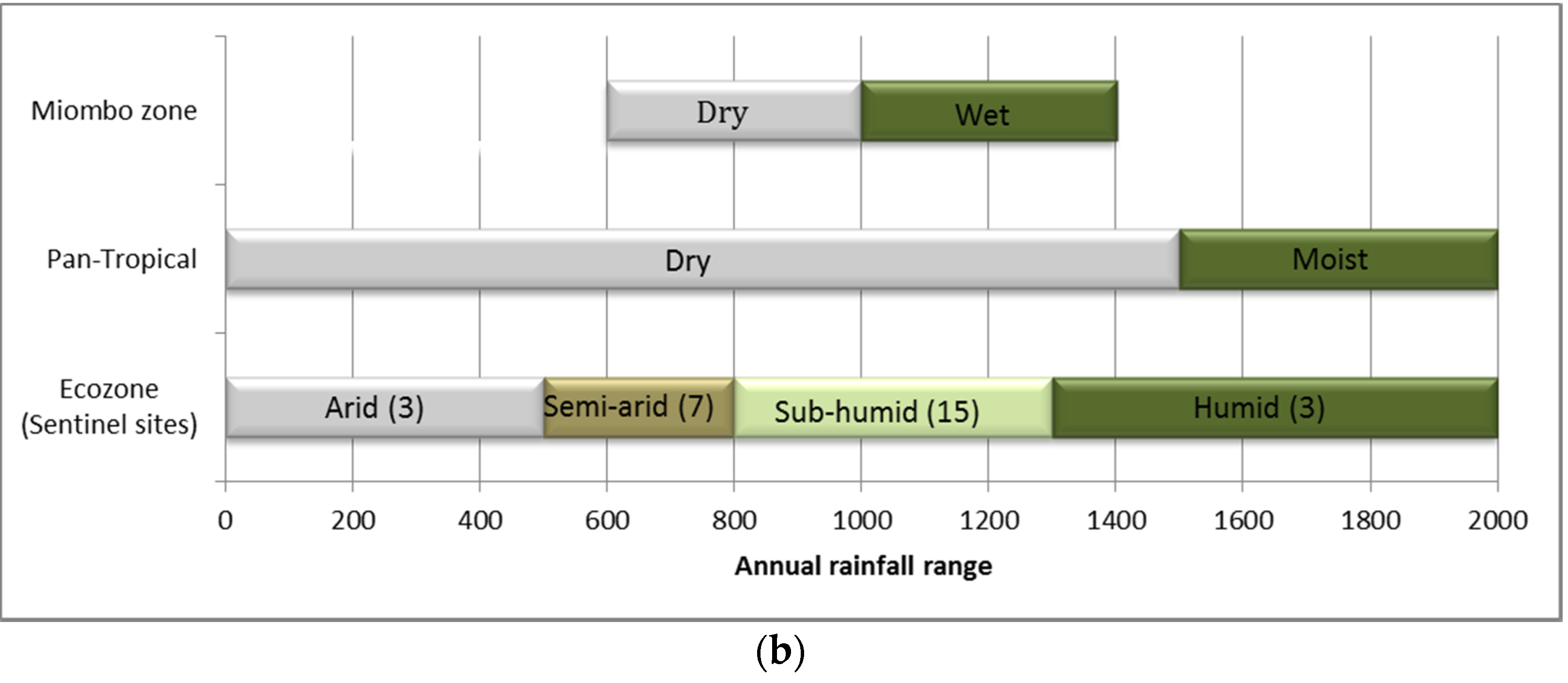 The study covered 29 sentinel sites located in Angola, Botswana, Malawi, Mozambique, Zambia, and Zimbabwe covering four eco-zones; i.e., arid, semi-arid, and sub-humid to humid climate (Figure 1a,b and Table 1). The eco-zones defined by the quotient between yearly positive precipitation and yearly positive temperature were used as primary clustering units as they show the bio-climatic gradient [16].