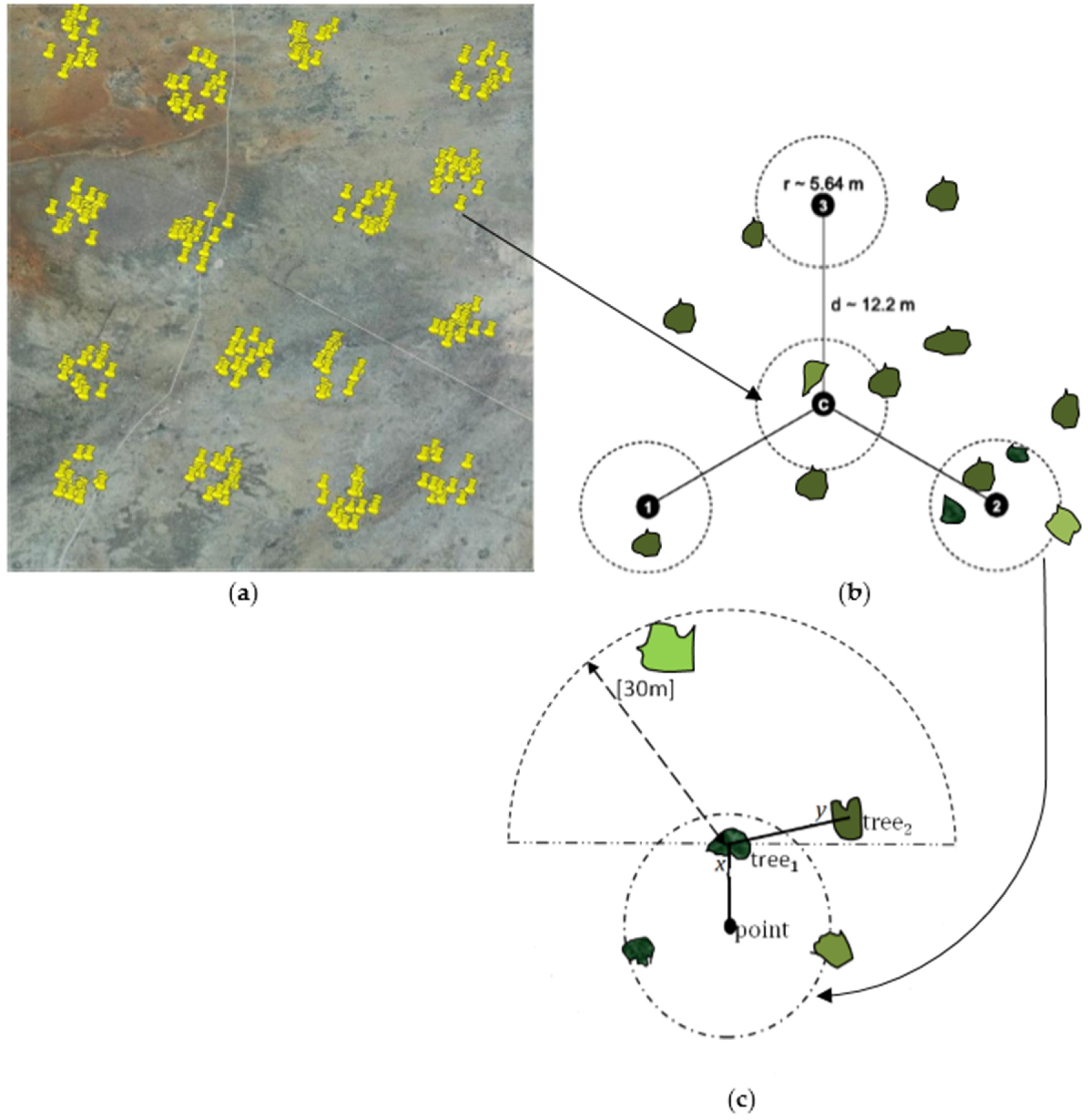 (a) Hierarchical sampling of plots (individual icons) in 16 clusters within the 10 by 10 km sentinel site (b) sampling subplots layout and (c) the T-square method employed to measure tree attributes for each subplot. NB: subplots c1 and c2 are non-vacant; c3 is vacant; and c1 could have tree 1 but no tree 2 within a 30 m radius (see Section 2.3 for details).