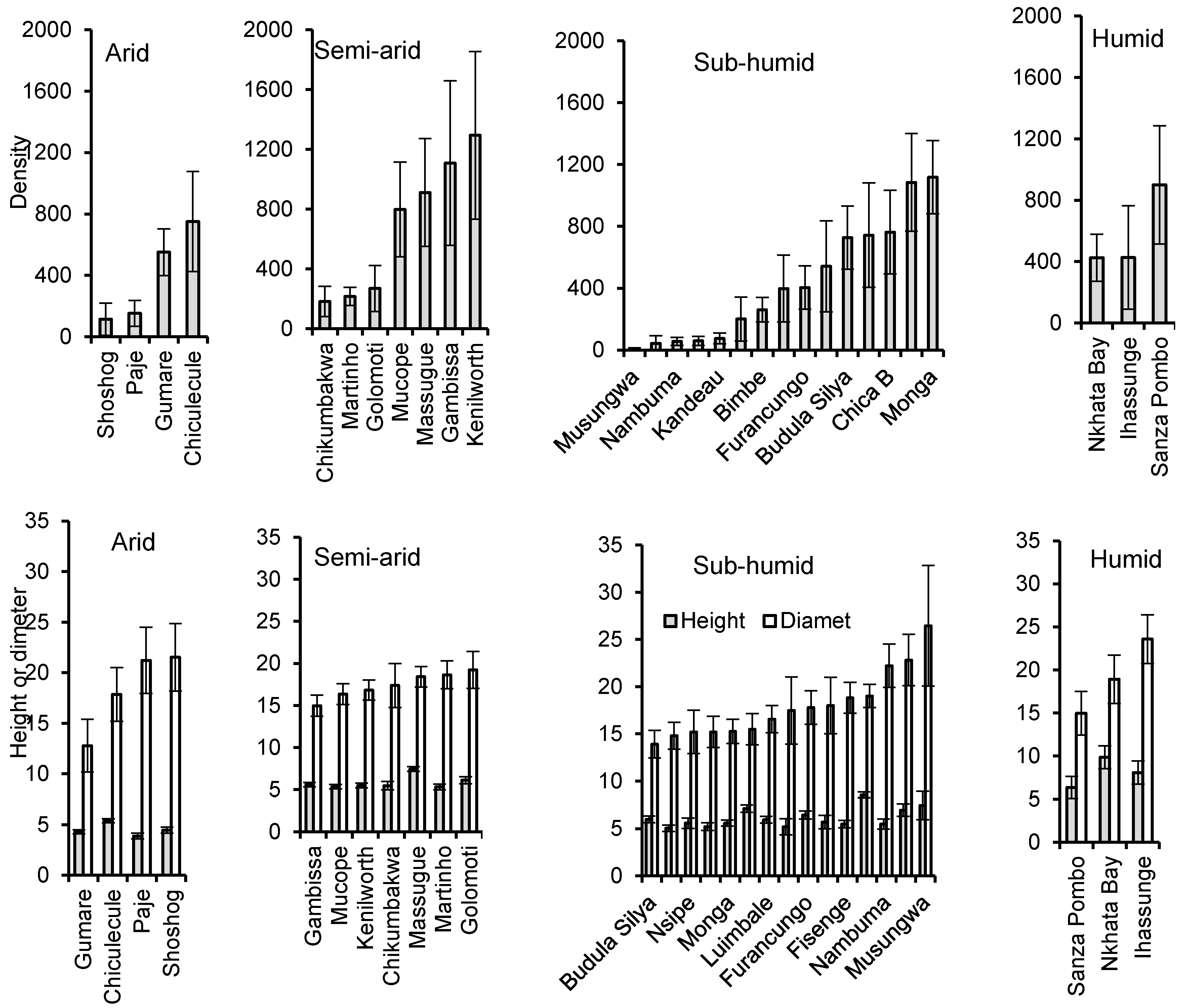 The average tree height significantly varied across sites and eco-zones (Figure 3, Table 4). Sites in humid areas had taller trees (mean 7.7 m) while those in arid areas tend to be significantly shorter (mean 4.6 m) than those in all other eco-zones. The average tree diameter also varied across sites and eco-zones (Figure 3, Table 4). Remnant trees in cultivated and drier areas had larger diameters than dense re-growth saplings in semi-arid and arid areas. Generally larger tree diameters were found in humid zones compared to the other eco-zones. However, the 95% CL does not indicate significant differences between eco-zones. With fewer trees, Musungwa in Zambia had relatively large diameter trees averaging 27.2 ± 18.0 cm. In this site, the trees are well preserved under co-management arrangement between the local community and Zambia Wildlife Authority since it is within the buffer zone of Kafue National Park. The arid areas, despite having shorter trees, tend to have larger diameter trees. Most trees in the area were coppice re-growth of multiple stems from single stump. The dominantly cultivated area of Nambuma (Malawi) had fewer and large diameter trees averaging 21.46 ± 20.6 cm. The sites with smallest diameter trees include Nsipe (Malawi), Gumare (Botswana) and Furancungo (Mozambique) with average diameters of 12.01 cm, 12.88 cm and 13.67 cm, respectively.