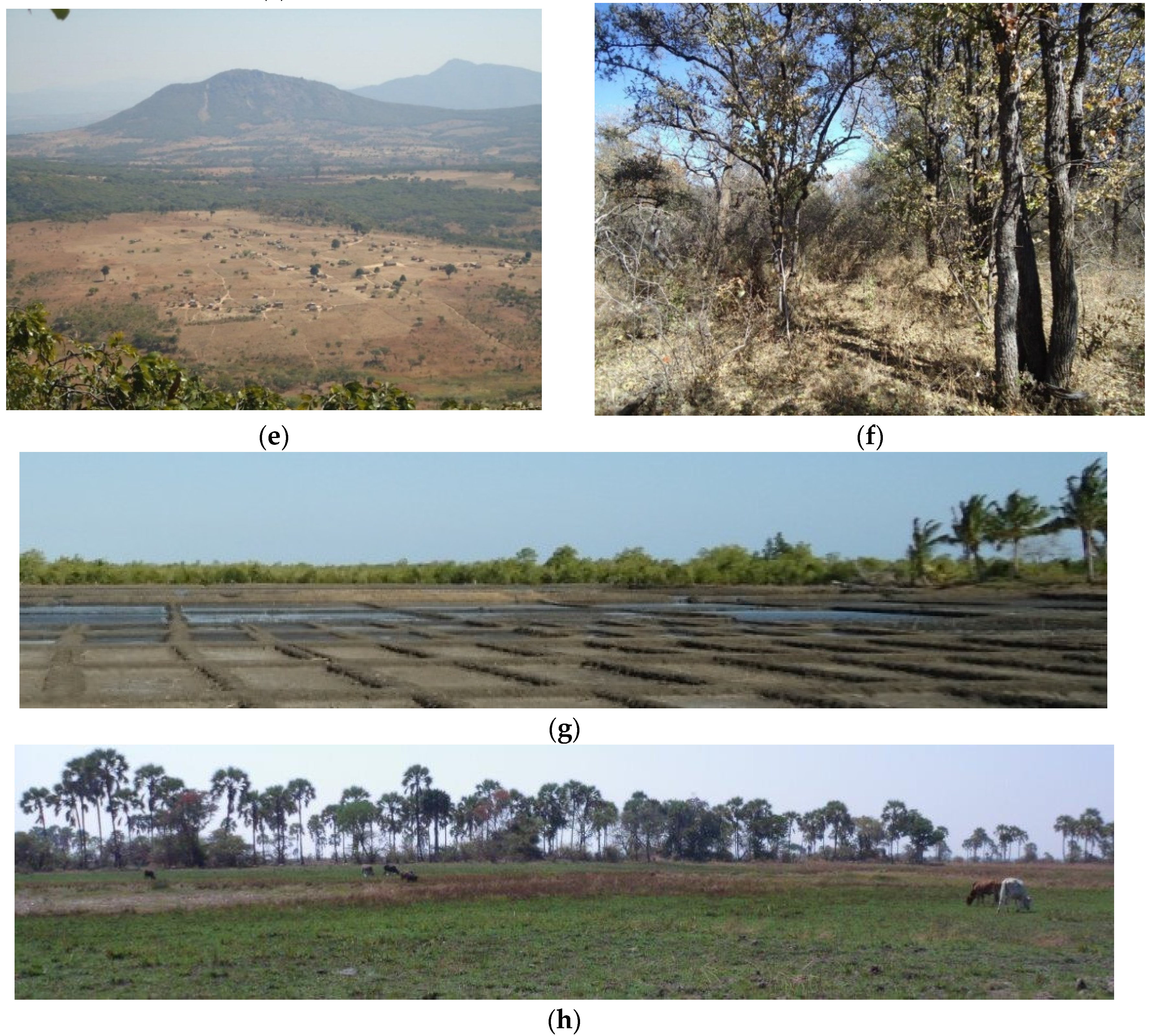 Tree and stand structure in varied land cover and use types (a) Miombo woodland at Massuque in Mozambique; (b) Terminalia woodland in arid zone at Gumare in Botswana; (c) trees on farm (scattered trees in intensively cropped areas at Linthipe in Malawi; (d) burnt and respouting trees with intensively grazed dry grass at Paje in Botswana; (e) intensively cultivated plains and forested hills at Luimbale in Angola; (f) intact mopane woodlands in semi-arid zone at Kenilworth in Zimbabwe; (g) mangroves with salt pans in depressions and trees on raised areas at Inhassunge in Mozambique; and (h) Dauwn palm on edge of Kafue river flood plain at Musungwa in Zambia.
