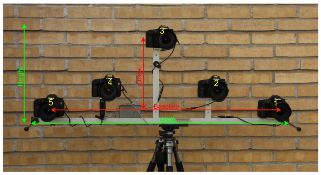 Three new Canon EOS 7D cameras with Sigma EX20/1.8 DG fixed lenses were attached to the rig at Positions 1, 3 and 5. Furthermore, two Canon EOS 40D cameras equipped with Canon EF–S 17–55/2.8 zoom lenses from a previous project were attached at Positions 2 and 4. The zoom rings were fixed with duct tape to minimize movement. The nominal focal lengths were 20 mm (Sigma) and 17 mm (Canon), respectively. All auto-focus and image stabilizing features were turned off. The cameras were synchronized by a cable trigger. Unfortunately, both 40D cameras were later found to have insufficient optical stability (see Section 2.4) and were only partially used in the study.