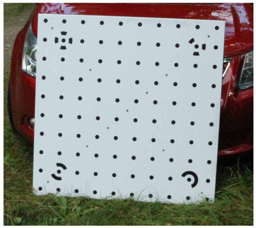 The calibration protocol specifies that each camera is individually calibrated at the beginning and end of a field campaign. About 25 images of a 1 m square planar calibration target (Figure 4) were acquired by each camera from different angles and distances. The calibration markers were measured semi-automatically and processed by the algorithm of Börlin and Grussenmeyer [20]. The calibration process was repeated at the end of the campaign to assess the optical stability of each camera. The calibration process estimates the internal geometry of each camera, for example the focal length and lens distortion parameters, and is essential for the subsequent image processing. The exposure parameters were chosen as a compromise between a high depth of field and a small motion blur; infinity focus, maximum ISO (7D: 6400; 40D: 1600), aperture f/11 and variable exposure time. The exposure parameters, except exposure time, were kept fixed throughout the campaign.