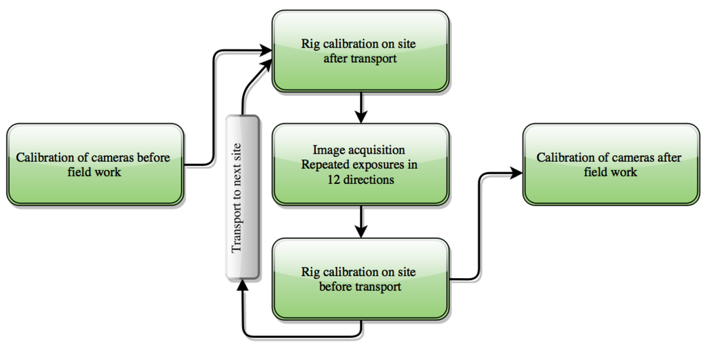 The rig was transported by car to a location within 1 km of each plot. After off-loading, the rig was carried through the forest using the EasyRig harness. Before and after each forest excursion, images of the calibration target were taken by the rig as described in Section 2.2 (For simplicity, the word image(s) is sometimes used to indicate a set(s) of images, simultaneously acquired by the rig cameras when the distinction is unnecessary or clear from the context. For the same reason, repeated exposures to prevent data loss are sometimes not mentioned). On the plot, images were acquired from the approximate plot center in 12 directions, separated by approximately 30 degrees. The magnetic compass was used as an aiming guide. To guard against data loss due to bad connectors, each exposure was repeated, both on-plot and for the rig calibration images. The flowchart in Figure 5 shows a visualization of the workflow.