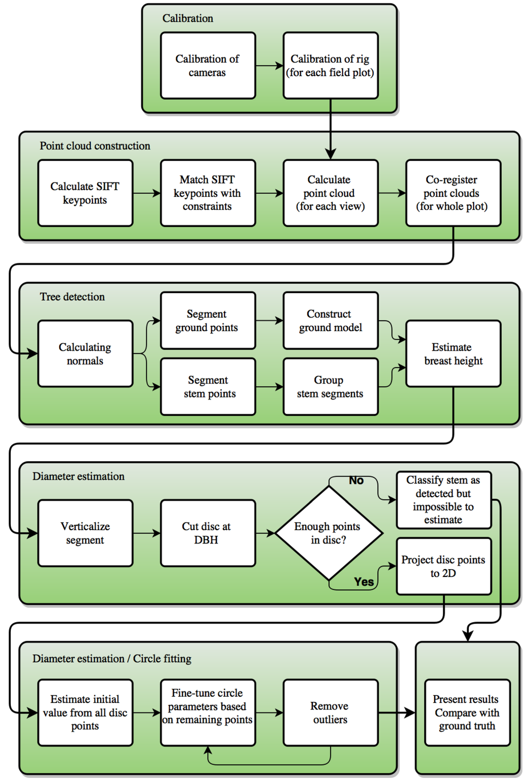 We have implemented a data processing pipeline that requires a low level of operator interaction. The input data to the pipeline consist of images from one field plot and calibration images. From the images, a point cloud was calculated for each view and co-registered into a point cloud for the whole plot. The point cloud was segmented, and stems were detected. From the stem segments, the DBH was estimated by circle fitting to a 2D projection of the points closest to breast height (130 cm). An overview of the data processing pipeline is presented in Figure 6. A more detailed description follows in this section. As indicated in Section 2.4, only Cameras 1–3–5 were used to produce stem segments. A second point cloud using Cameras 1–2–3 was used in conjunction for the co-registration.