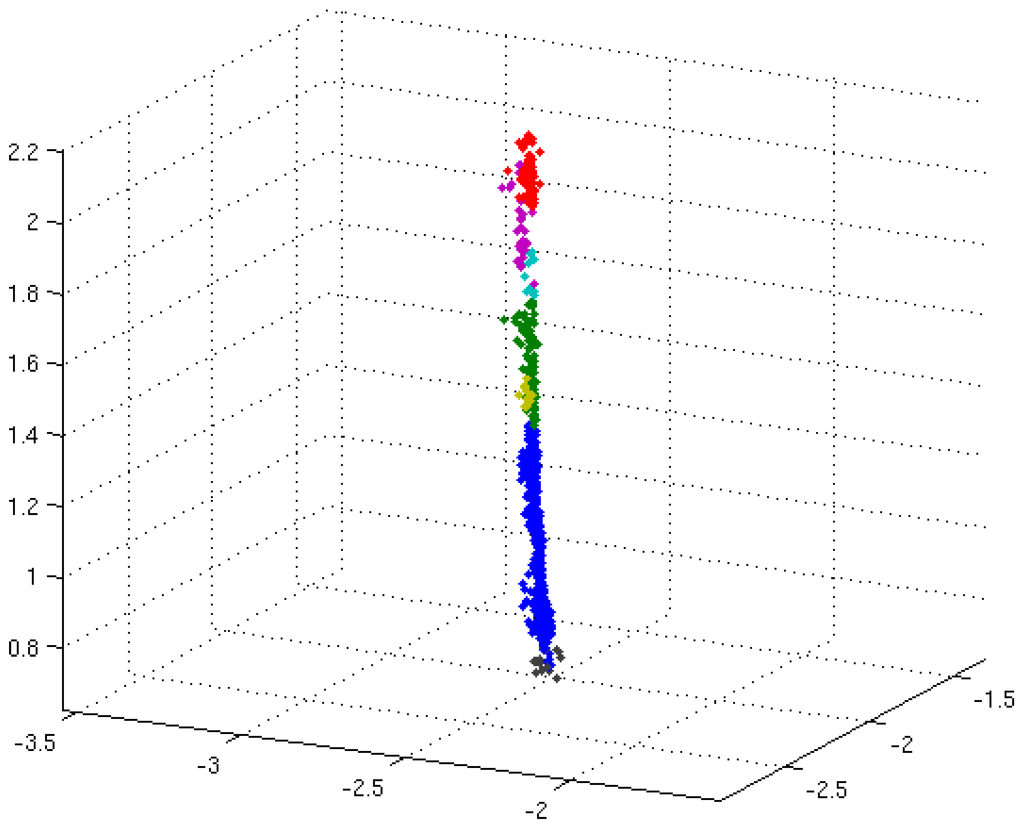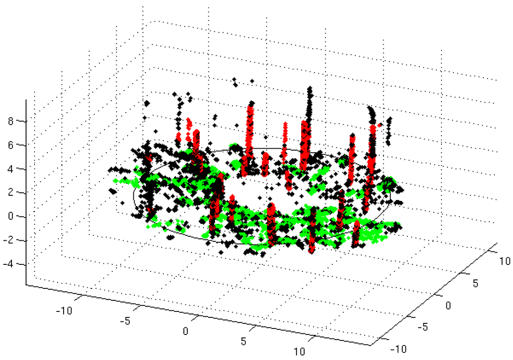 The tree detection algorithm is similar to the algorithm used in, e.g., Liang et al. [6], Pfeifer et al. [27]. The normal direction of a point describes the orientation of a surface spanned by the point and its neighbors. For each 3D point in the point cloud, the normal direction was calculated from the 18 nearest neighbors by the algorithm in the CGAL (The Computational Geometry Algorithms Library) Library [28]. The co-registered point cloud was segmented into possible stem points, ground points and other points (see Figure 7). Ground points are assumed to have roughly vertical normals, with a normalized vertical component larger than 0.7.