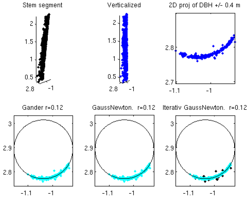 Upper row: An example of a stem segment before (left) and after (center) verticalization. Verticalized points at a height interval of 1.3 m (breast height) m were cut out and projected to 2D (right). Lower row: A circle was initially fitted to all points by the method of Gander (left) followed by iterative Gauss–Newton (center). If necessary, outliers were removed, and the Gauss–Newton procedure was repeated. The rightmost subfigure shows the result after final outlier removal and with outliers as black points. In this example, the differences between the circle estimates are too small to be seen.