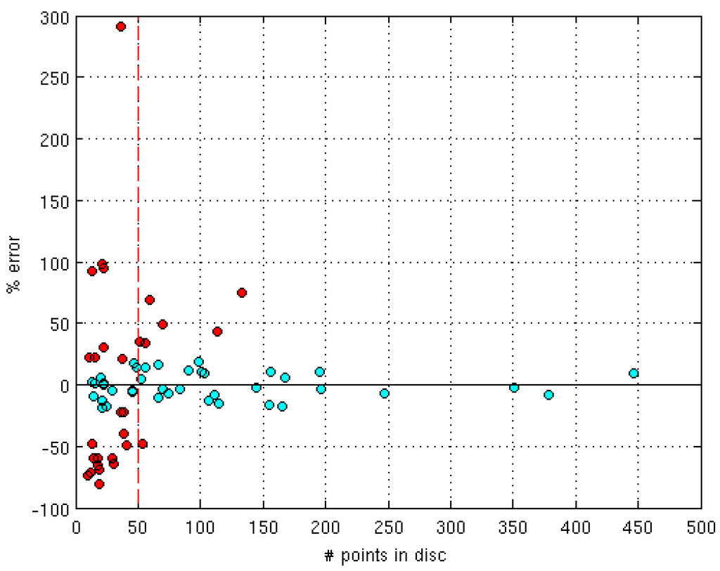 Relative error in diameter estimation vs. the number of points in the disc used for circle estimation. Red points indicate errors of at least 20% of the tree diameter, and cyan points mark errors less than 20%. For discs with less than 50 points (left of the red vertical line), the occurrence of gross errors is significant.