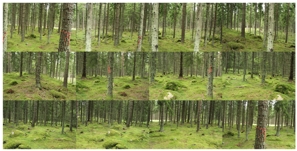 A dataset was acquired during a three-day field campaign at the Remningstorp estate (N58.46°, E13.65°) in southern Sweden. The forest is hemi-boreal and dominated by Norway spruce and Scots pine with some deciduous trees, mostly birch. Images were collected on 25 field plots with a 20-m radius. The plots were selected to include various forest types, ages, species composition and stem density. Ground truth data were gathered for each field plot. The DBH of each tree was measured crosswise with a caliper. Tree positions were acquired using a total station.