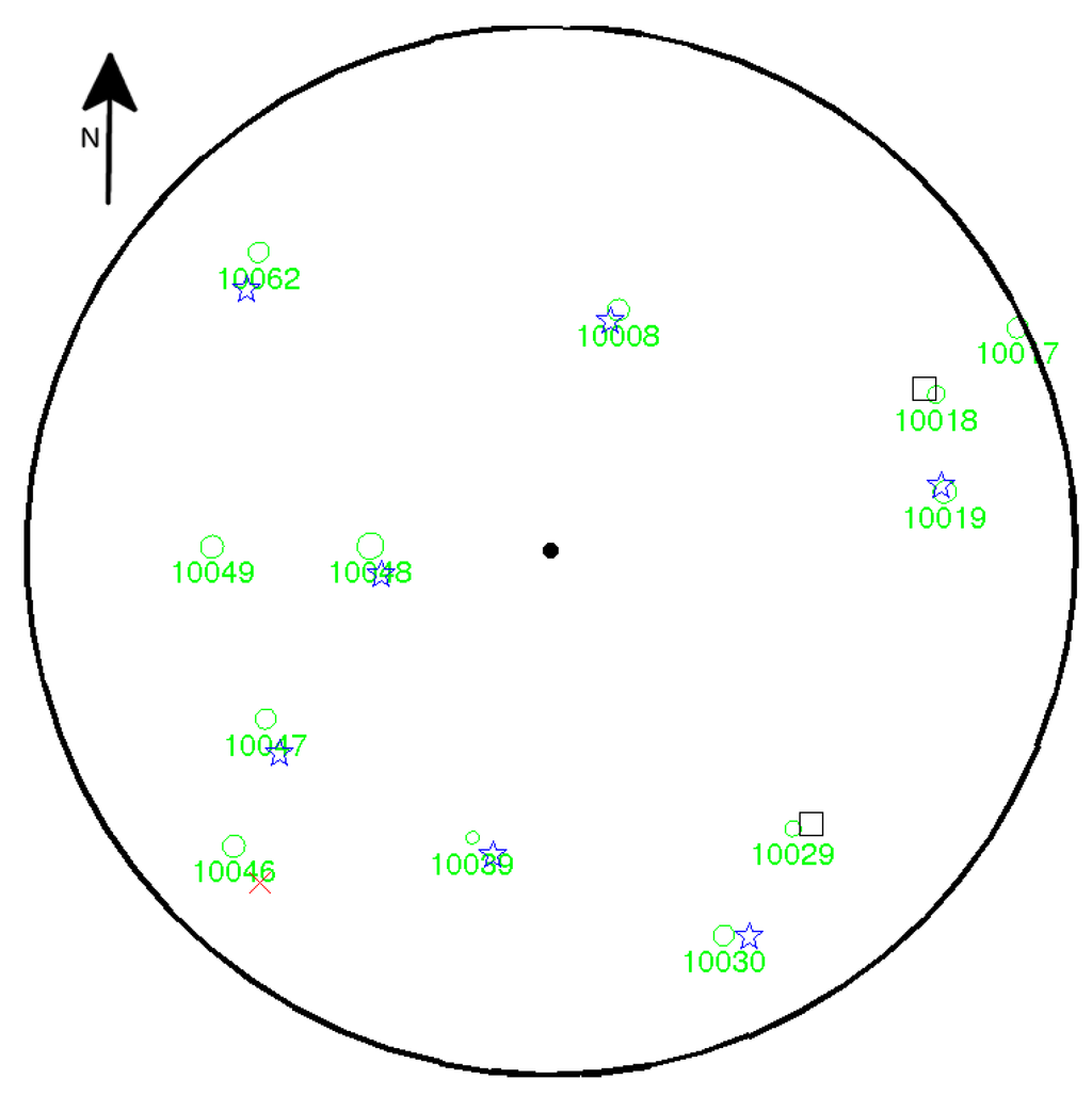 Results for field Plot 165. The green circles and ID numbers correspond to ground truth data. The circles are plotted to scale. Only trees within 10 m (large black circle) are indicated. Blue stars indicate correctly estimated trees (diameter within 20% of the ground truth). Red crosses indicate incorrectly estimated trees (diameter not within 20% of the ground truth). Black squares indicate detected, but not estimated trees (too few points). The camera rig position is near the center of the plot. Most trees have been detected. About half of the detected trees were also correctly estimated. The invisible trees are all obscured by trees closer to the plot center. Most position errors are below 0.5 m. A systematic shift to the southeast for the detected trees is visible, indicating a slightly off-center rig position.