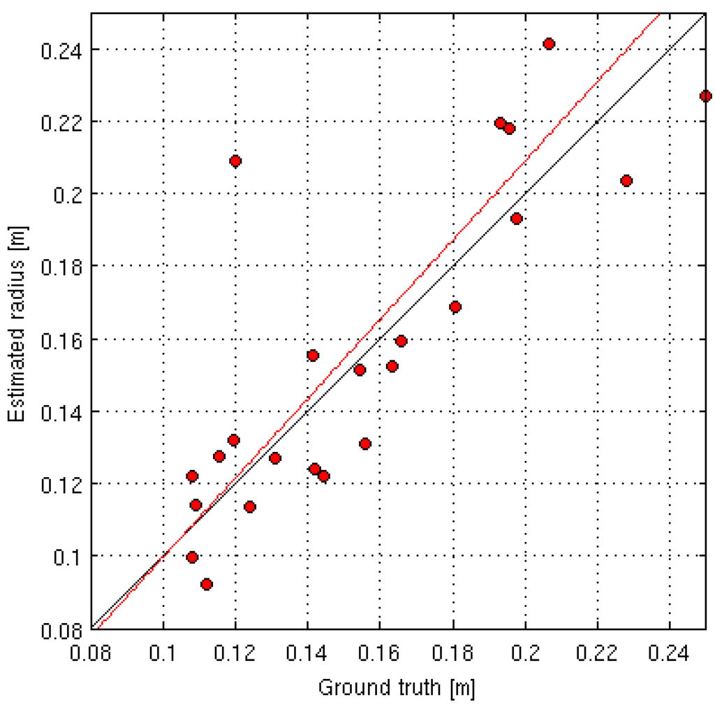 The accuracy of the stem diameter estimations was clearly dependent on the number of 3D points on the tree stems, especially near breast height. The number of points was a function of the thresholds used in the algorithm used for the 3D point clouds’ construction. A higher number of 3D points could have been produced with lower thresholds, but the point cloud would include more false points. On several of the detected tree stems whose diameter could not be estimated, the detected points were clustered above and below breast height with few points usable for DBH estimation. One way to estimate the diameter of such partly-occluded trees could be to fit a tapered cylinder to the detected point clusters.
