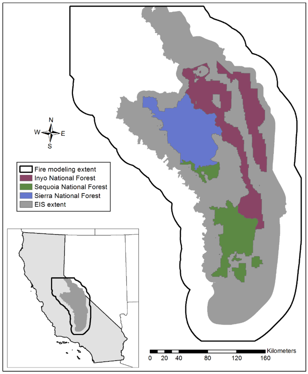 The study area encompasses the Inyo, Sequoia, and Sierra National Forests, which are located in the southern Sierra Nevada Mountains in California, USA. These three Forests are “early adopters” of the US Forest Service’s 2012 Planning Rule, and as of this writing are in the process of updating their Land and Resource Management Plans (LRMPs). Agency-wide guidance directs National Forests to spatially depict LRMPs, and the Pacific Southwest Region further directs National Forests in California to incorporate fire management wildfire risk into these plans. Guidance in LRMPs ultimately provides the basis for spatial fire plans as well as strategic fire management objectives.