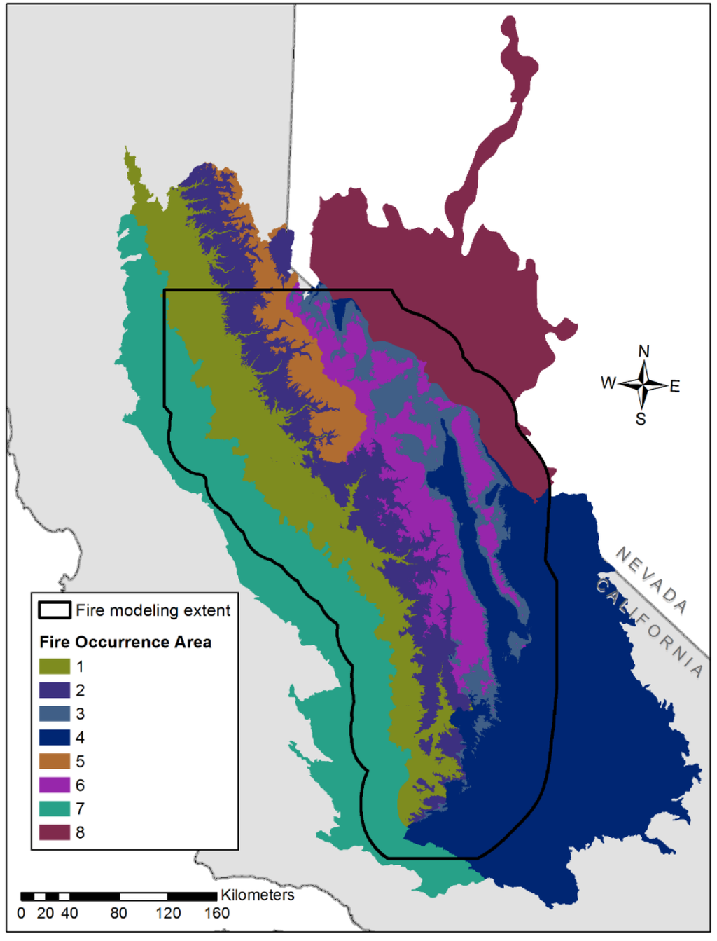 The fire modeling area for the SSRA area is a 9.7 million ha extent characterized by vegetation conditions ranging from valley-bottom grasslands in the Central Valley to alpine timber at the highest elevations, and to arid sagebrush shrubland on the lee side of the Sierra crest. Because this landscape is so large and variable, historical fire occurrence and fire weather summaries for the entire area are inadequate to characterize the variability within and among some of the distinct vegetation communities found along elevation gradients within this landscape. Therefore, we summarized historical fire occurrence for eight different fire occurrence areas (FOAs) within the SSRA greater landscape. The boundaries for these areas are based on elevation-based ecozones, aggregated where appropriate for fire modeling purposes. The resulting FOAs are mapped in Figure 3 and their land-area extent summarized in Table 1.