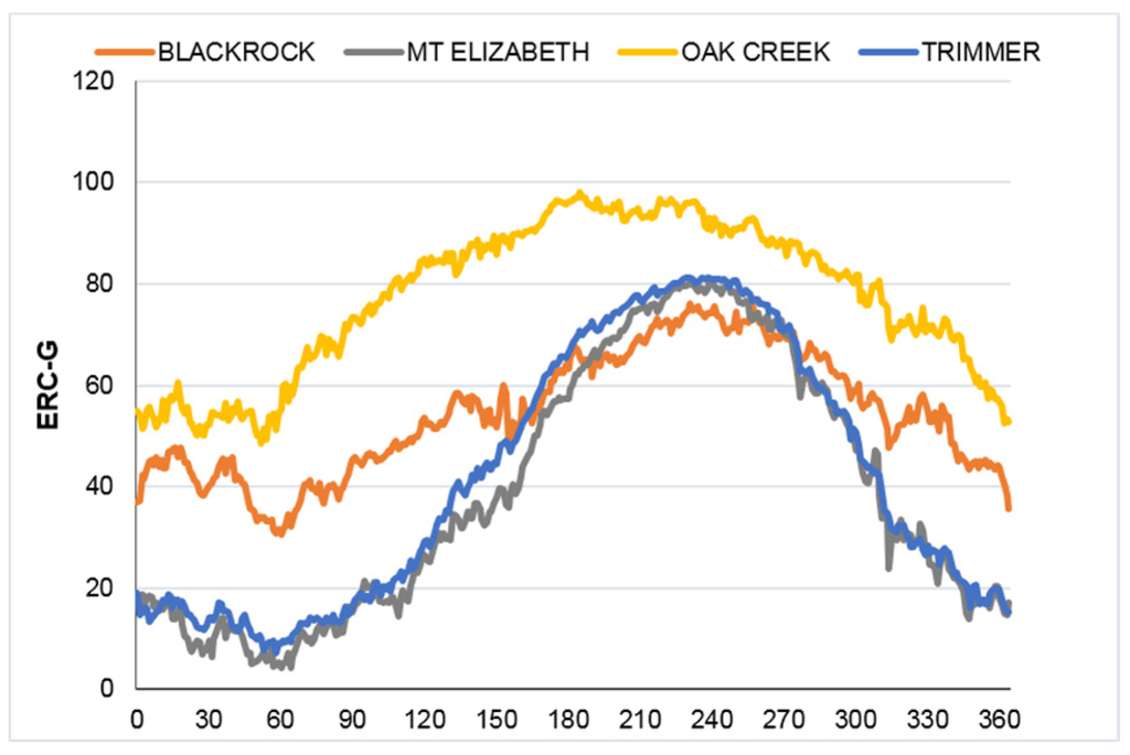 ERC-G by Julian day for each of the four RAWS locations used in fire modeling.