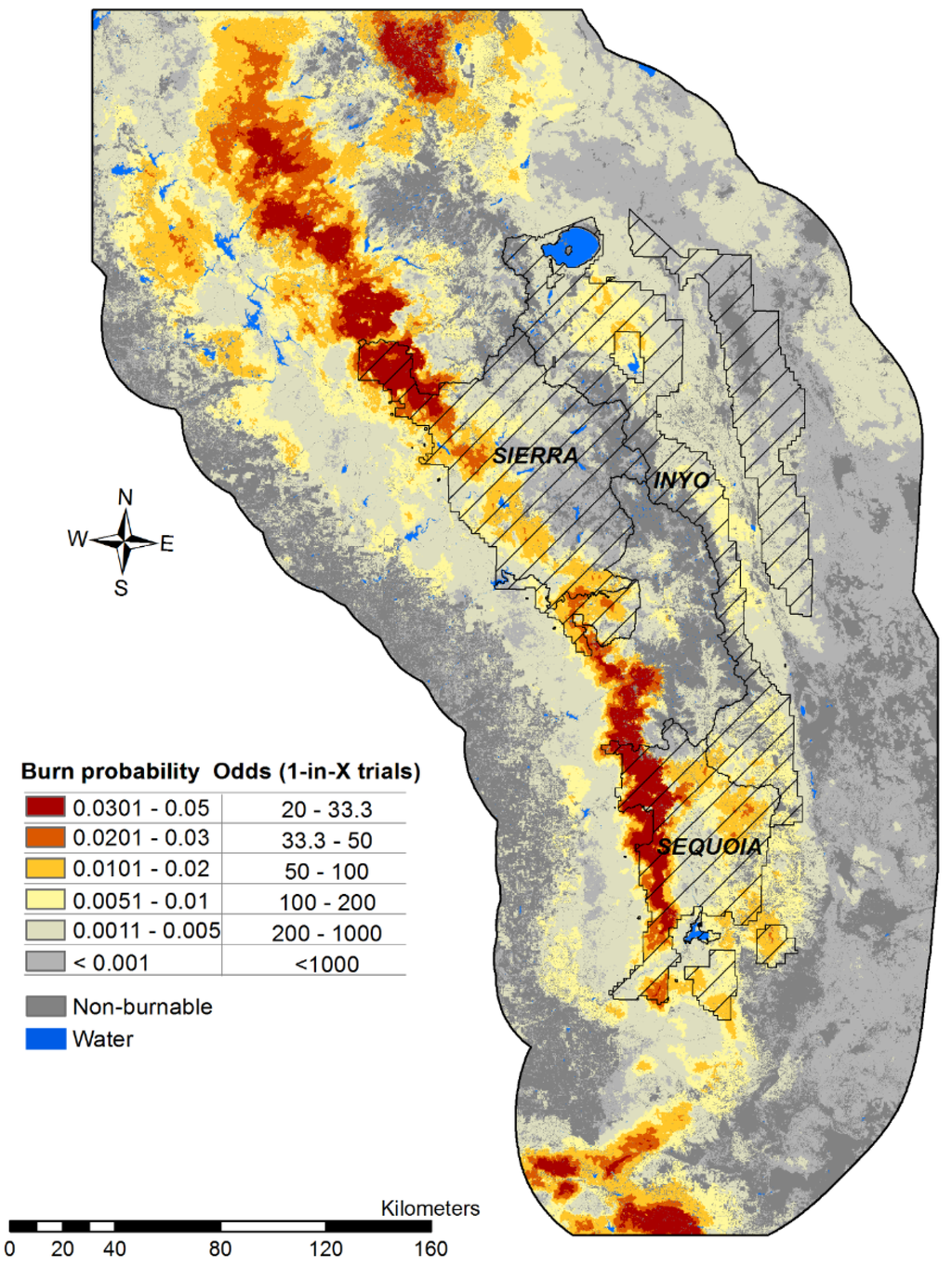 Burn probability results for the Southern Sierra Risk Assessment landscape.